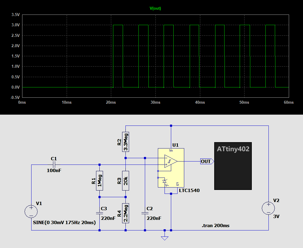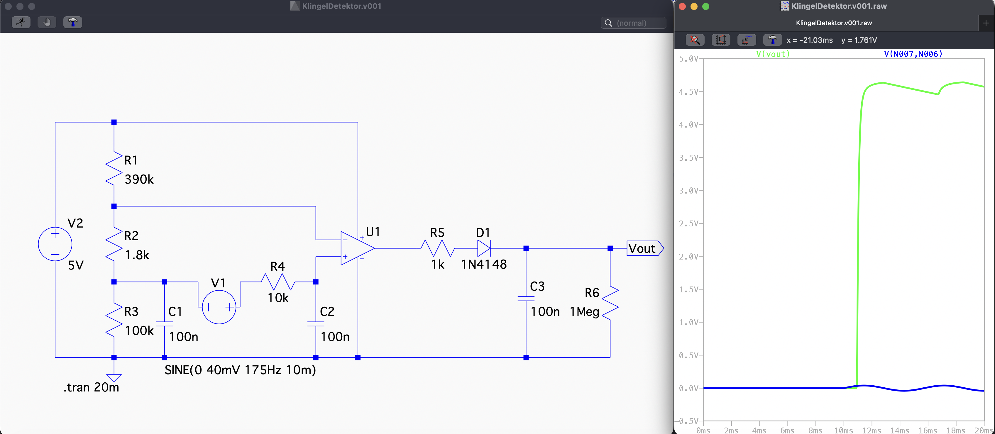 Anbei ein Simulationsversuch von wolf17's Schaltung für LTspice. Die Spule habe ich durch eine 40mV Sinusquelle ersetzt - wusste mir nicht anders zu helfen - auch wenn das die Spule nicht richtig simuliert. Wolf's 18k Widerstand musste ich auf 2k reduzieren, damit die 40mV detektiert werden - 18k waren etwas zu viel des Guten. Hoffe, ich habe um diese Zeit keine Fehler gemacht - ich sollte eigentlich schlafen statt simulieren :-) Viele Grüße Igel1