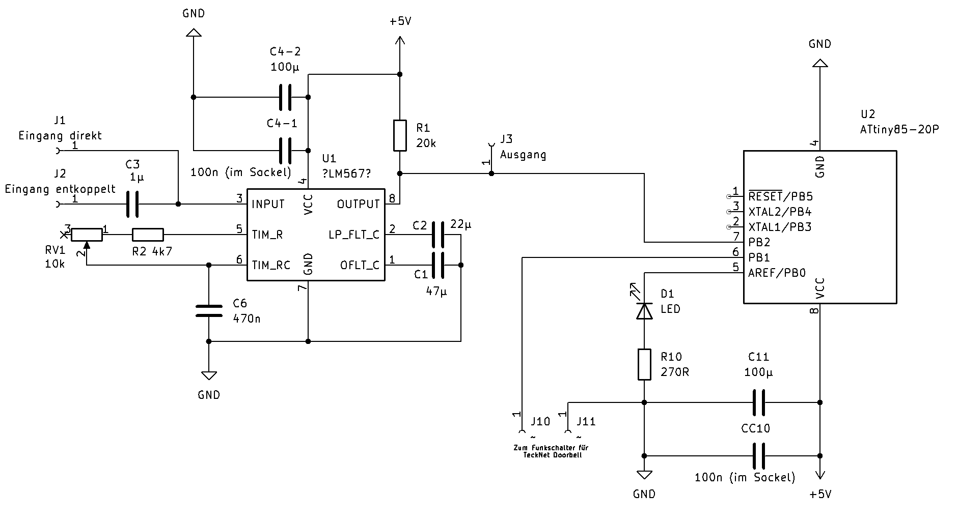 Der Eingang Pin 3 hat zumindest beim bipolaren LM567 intern eine Biasspannung, der muß über einen Kondensator angesteuert werden! C2 ist Teil eines Ausgangsfilters, dem ein Komparator mit fest eingestellter Referenzspannung folgt. C2 muß daher nach der "Tastfrequenz ein/aus" (Amplitudenmodulation) ausgelegt werden. Umso größer der Kondi ist, umso störunempfindlicher ist die Erkennung, aber umso langsamer muß der Postbote klingeln. Also länger drücken bzw. die Pause dazwischen größer sein. Hier ist halt ein Kompromiß zu machen.