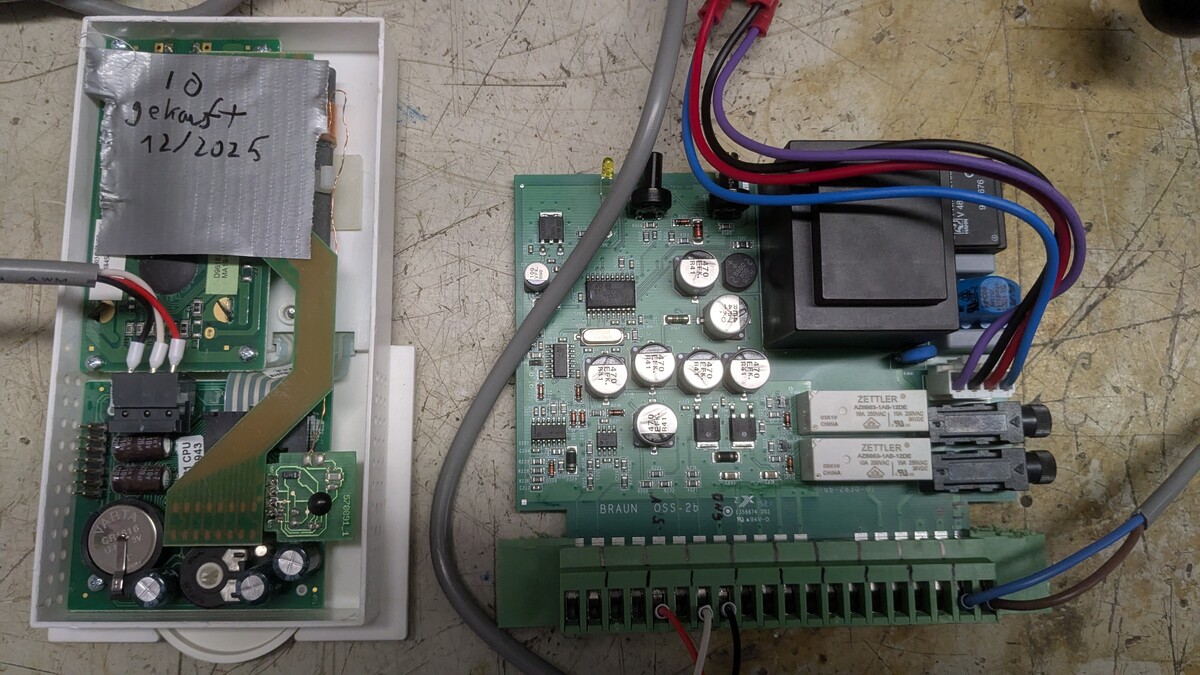 Hallo zusammen, ich habe an meiner Ölheizung ein Schrag / Braun ZE-2B eingebaut. An der Raumtemperatureinheit RT2001 wird nur ein schwarzer Balken angezeigt. Um herauszufinden ob es am RT2001 oder am ZE-2B liegt habe ich die 5V Versorgung am ZE-2B gemessen. Wenn das RT2001 nicht angeschlossen ist, sind die 5V Stabil. Sobald ich das RT2001 inkl. Signalleitung anschließe habe ich nur den schwarzen Balken, und die 5V schwanken zwischen 1,3 und 5V. Sobald ich aber die Signalleitung trenne, sind die 5V am ZE-2B Stabil und das RT2001 bootet und zeigt die soll und ist Temperatur wie gewohnt an. Am Festspannungsregler 7805 auf der Platine habe ich Stabile 5V auch mit angeschlossener Signalleitung. Hat jemand eine Idee warum die 5V schwanken? (Ich habe ein Ersatzgerät für das RT2001 angeschlossen. Dieses verhält sich gleich. Also gehe ich davon aus damit das am ZE-2B liegt) Hat jemand ev. einen Schaltplan der Platine oder eine Idee was da defekt ist? Vielen Dank für Eure Hilfe Gruß frank