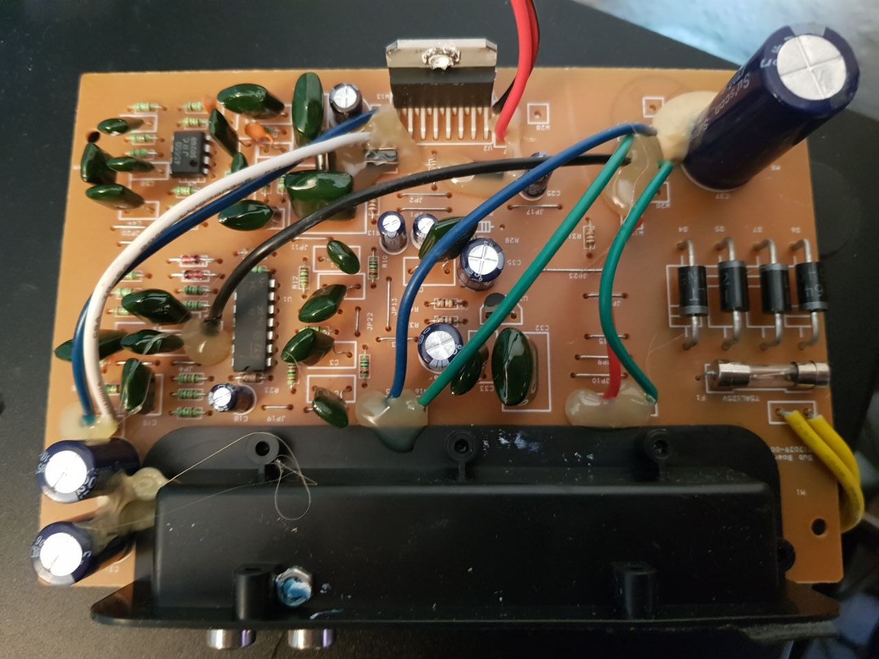 Lu schrieb: > Evtl. haben Elkos dicken Backen bekommen? Sie sehen alle gut aus. Auf dem Bild kann man nur den großen gut erkennen. Die anderen sehen aber auch gut aus.