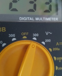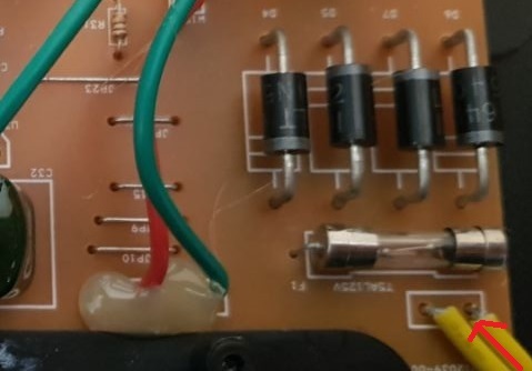 Den Trafo habe ich wieder zusammengesetzt, eine der beiden gelben Leitungen von der Platine gelötet und ein Bein der Feinsicherung entfernt. Gemessen habe ich dann die Spannung zwischen der freien gelben Leitung und der Sicherung. Auch ohne die Sicherung kam es zum gleichen Messergebnis.