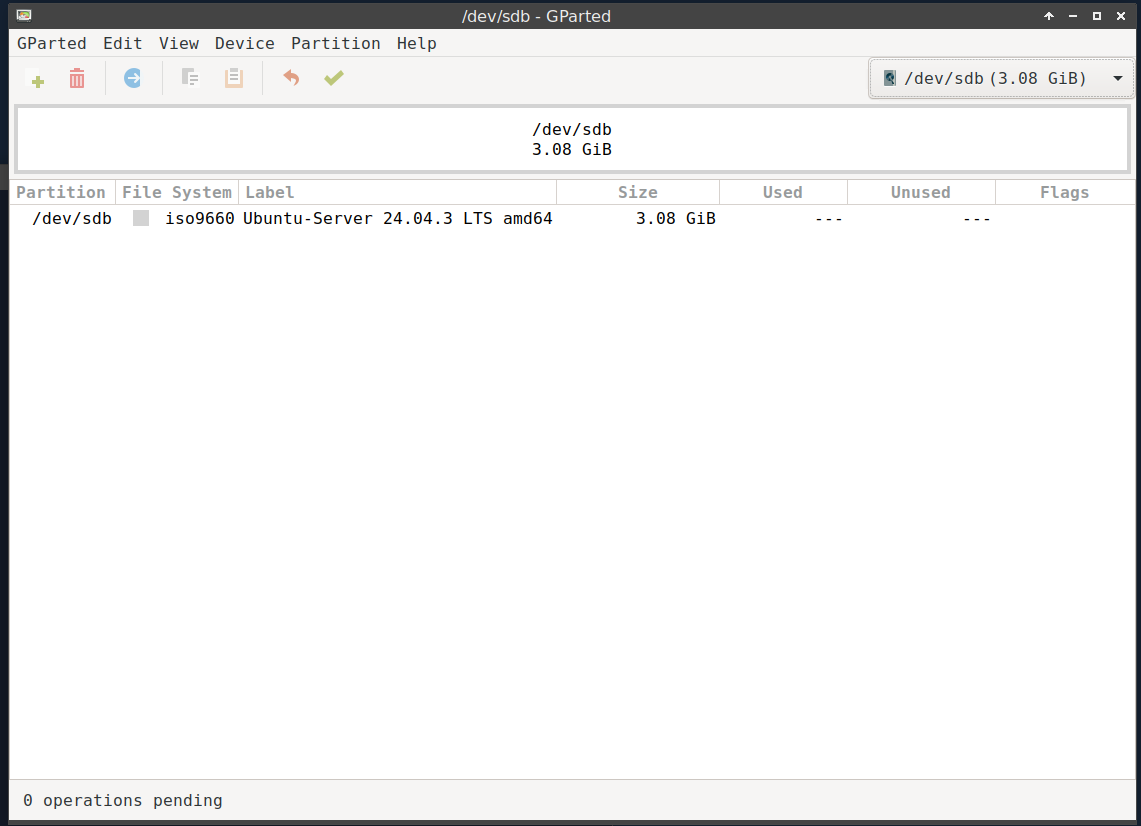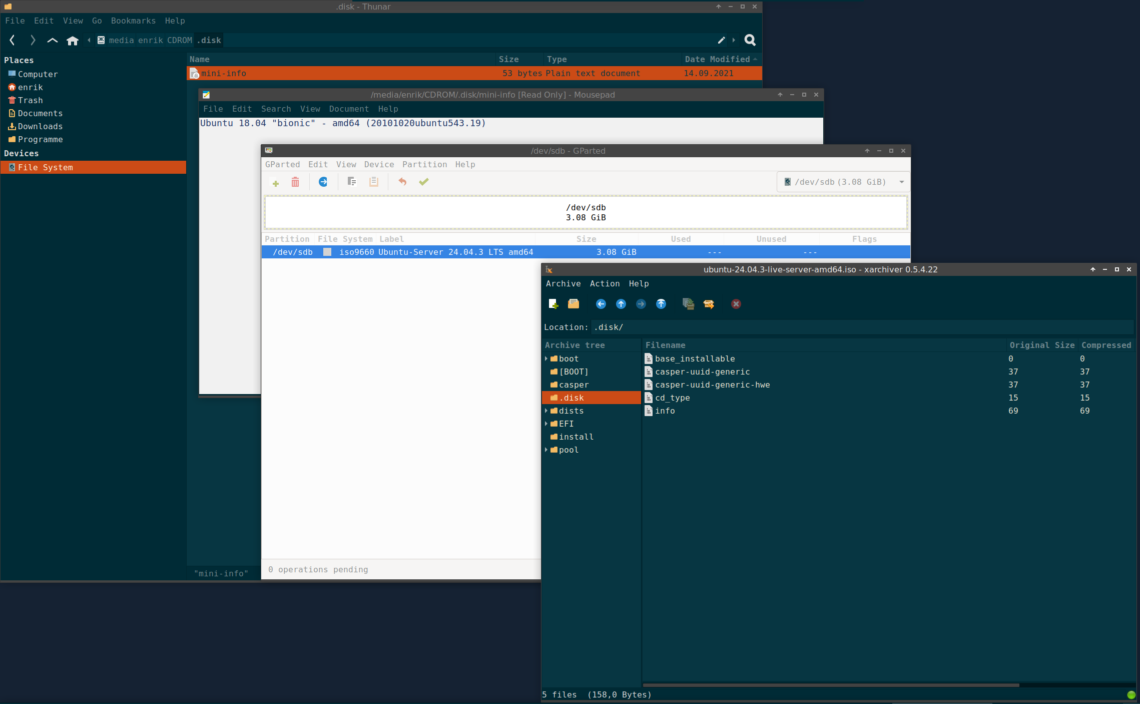 Also ich verstehe das nicht. Das ISO ist korrekt die 24.04 (ursprünglich 22.04), aber wenn Ubuntu den Stick mounted ist in .Disk/mini-info 18.08 drin? Im Screenshot ist der Stick schon wieder dismounted, das passiert wenn man Gparted startet. Aber die .Disk/mini-info hatte ich offen gelassen. In 24.04 sieht .Disk/ auch anders aus.