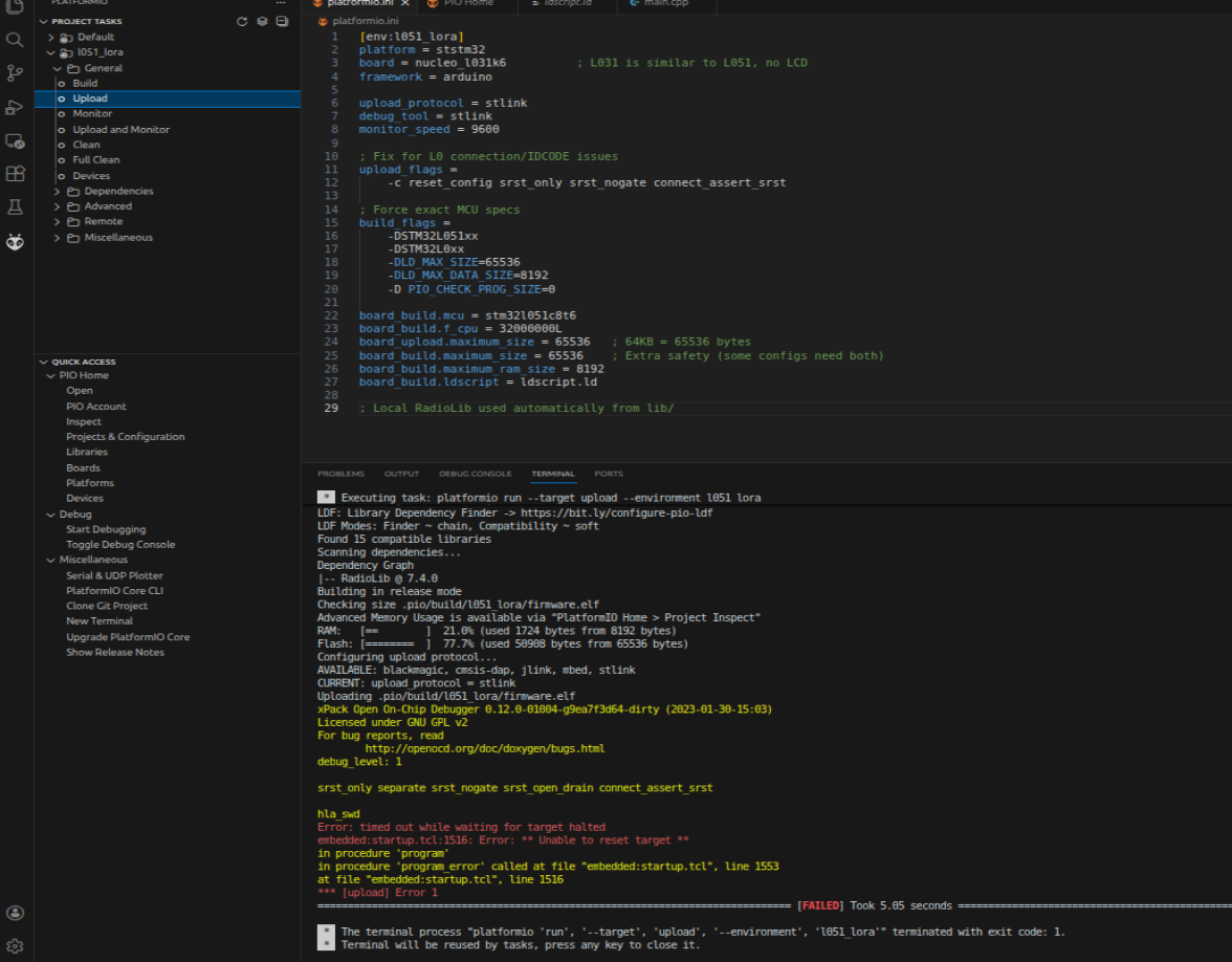 Hallo, Ich hätte eine grundlegende Frage wie ich das Board flashen könnte. Ich verwende ein ST-Link V2 dafür... ich habe verbunden, STM32 -> ST-Link: CLK -> SWCLK DIO0 -> SWDIO GND -> GND 3.3V -> 3.3V ich hatte auch versucht den RST des STM32 auf der anderen Seite mit dem ST-LINK RST zu verbinden, leider ohne Erfolg. Ich verwende VSCode unter Ubuntu mit PlatformIO extension. Ich kann anscheinend "build" ausführen aber nicht den "upload" in der PlatformIO Umgebung. VG