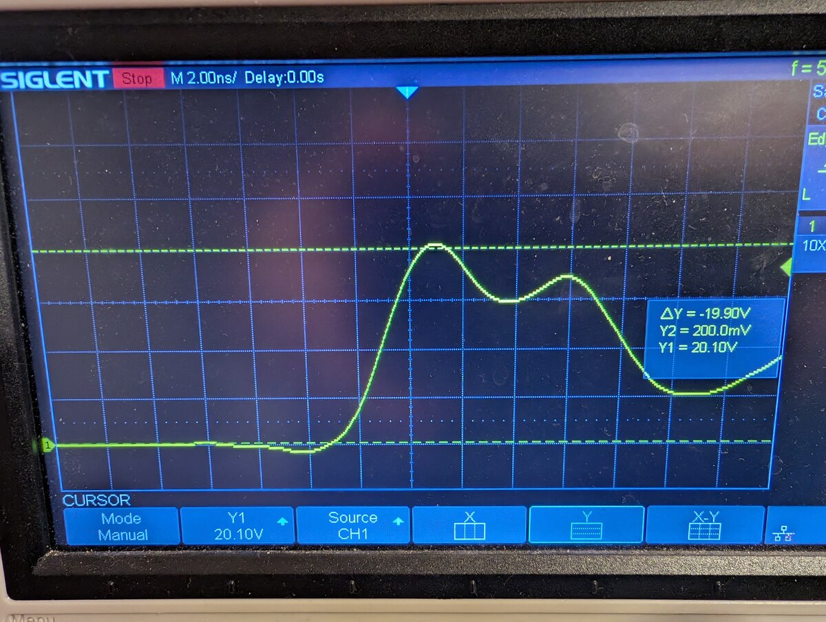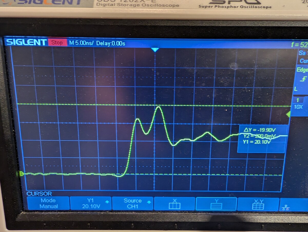 Wie hast du das gemessen? Entspricht die Messung der Realität? Ich messe da gerne mal GND, also kurzgeschlossenen Tastkopf an GND meiner Schaltung. Siehst du da schon das Schalten? Das sind ~2ns rise time, bei der Frequenz sieht man viele lustige parasitäre Effekte. Die Tastkopfleitung hat Induktivität und zusammen mit der Kapazität des gesamten Aufbaus wird das auch irgendwo schwingen. Vielleicht hast du das aber berücksichtigt und richtig gemacht.