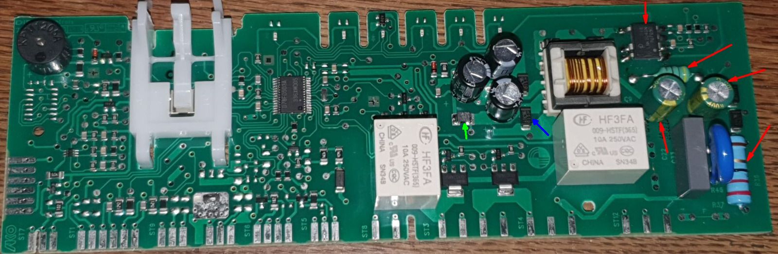 Moin, weiter gehts mit Überspannungsschäden. Meine Gefriertruhe hab ich erfolgreich repariert. Mein Gefrierschrank macht immerhin die ersten Piepser wieder, aber die Elektronik läuft nicht stabil. Kann mir jemand sagen, was für ein Bauteil das auf dem Bild ist? Das hat in beide Richtungen Kurzschluß, das scheint mir nicht so zu sein, wie es soll... Gruß, Martin