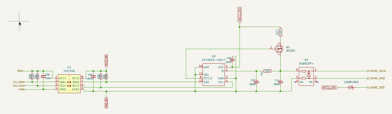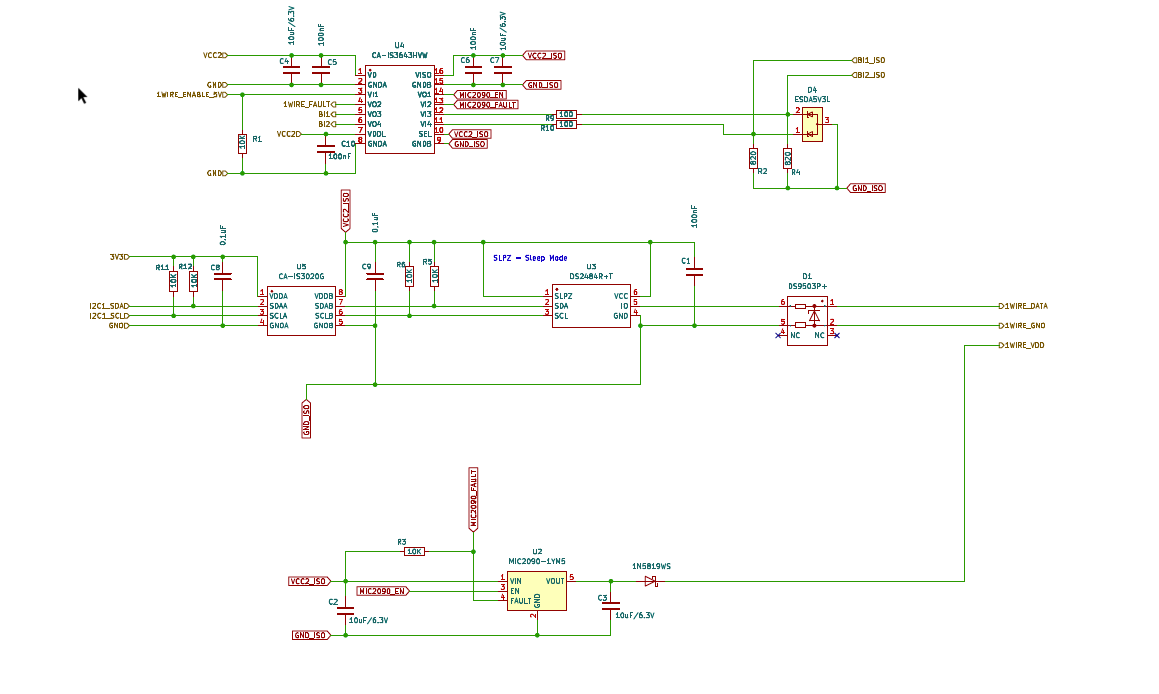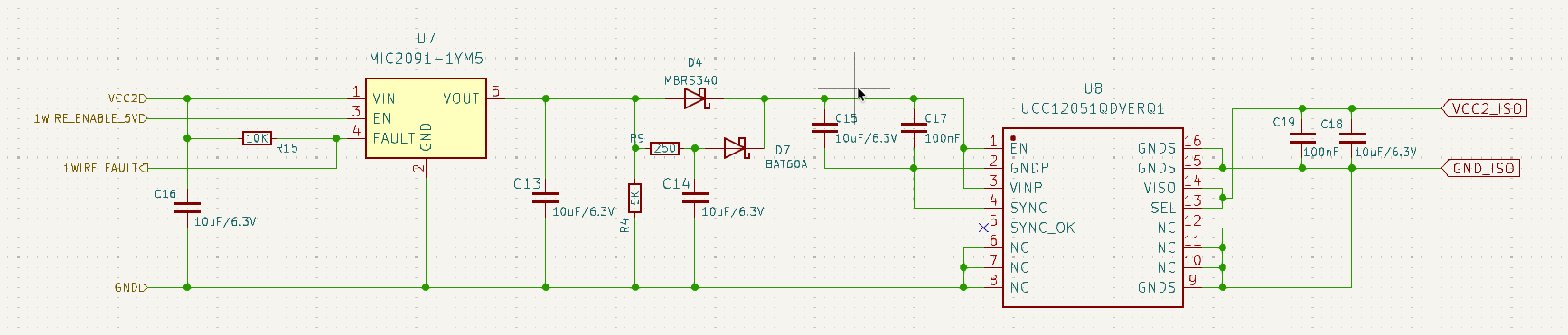 Hallo zusammen, ich bräuchte mal etwas Input zu der angehängten Schaltung. Das Ziel ist eine Stabile Ausgangsspannung hinter dem DC/DC Konverter zu bekommen. Die Spannungsquelle VCC2 kann maximal 100mA@5V liefern, daher soll der MIC2091 dies Sicherstellen und zusätzlich soll eine Pufferschaltung die 5V hinter dem DC/DC Konverter stabil halten da dort ein 1Wire Bus angeschlossen werden soll. Macht dies so Sinn oder ist dies alles völliger Murks? Auch ist der aktuelle DC/DC Konverter nicht optimal da dieser eine der hohe Aufnahme im Leerlauf hat und somit die Spannungsquelle oder Pufferschaltung unnütz belasten würde. Da die PCB bei JLCPCB (ist einfach sehr günstig dort) gefertigt werden soll sind leider auch nur begrenzte DC/DC Konverter verfügbar. Eingebaut werden soll dies dann in ein REG Gehäuse im Schaltschrank ich muss daher auch etwas auf die Wärme achten. Grüße und Danke Marco