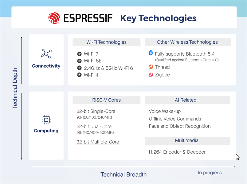 Espressif Systems hat neue Mikrocontroller vorgestellt: Den ESP32-E22 mit: - Dual-RISC-V mit 500MHz - 1MB RAM (kein PSRAM) - Tri-Band 2,4/5/6 GHz, 160 MHz Kanalbreite, 2x2 MIMO - Dual-Mode Bluetooth 6.0 - Interfaces: PCIe, USB, SDIO und den ESP32-H21 mit: - Single-RISC-V mit 96MHz - 320KB RAM - Bluetooth LE und 802.14.5 (Thread/Zigbee) - Ultra Low Power - DC/DC Konverter Außerdem wird noch ein Multi-Core (also >2 Cores) kommen, wie man auf der Graphik sieht.