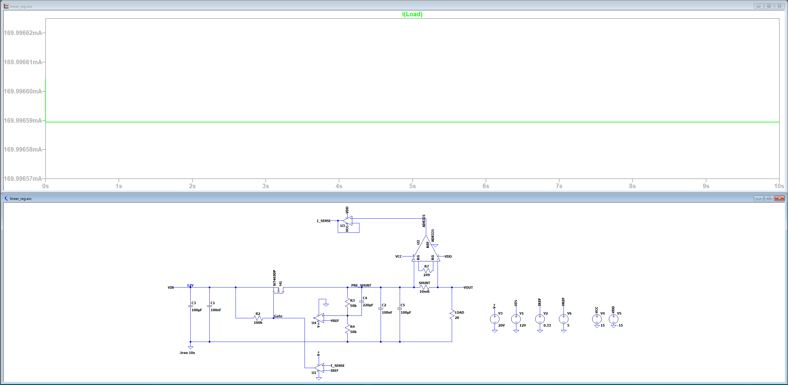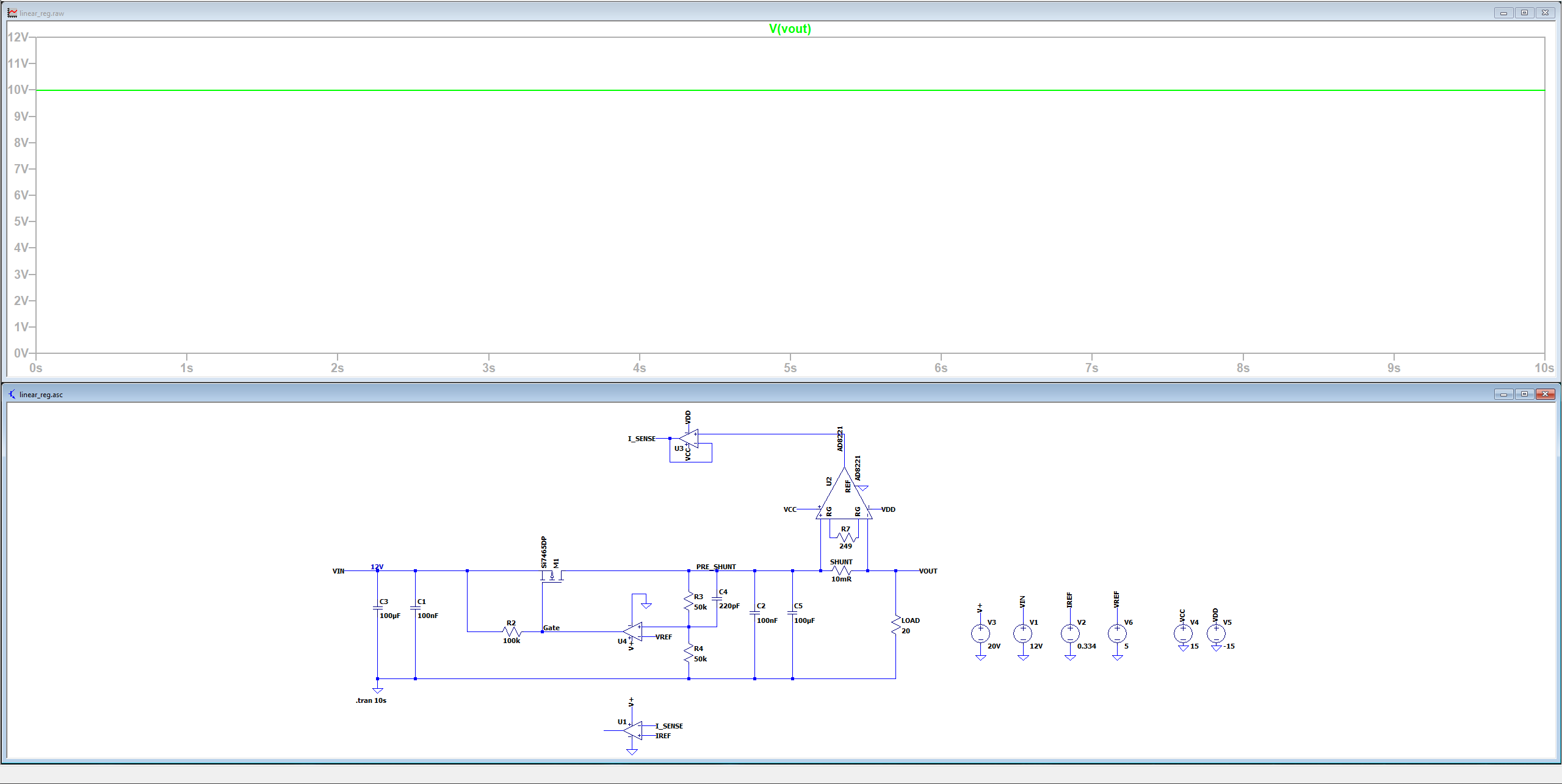 Hallo, ich habe eine Frage zu diesem linearen Netzteilen. In den Screenshots sieht man einen Regler im CV-Modus (Konstantspannung) und einen im CC-Modus (Konstantstrom). Beide Regler funktionieren für sich allein, aber mein Ziel ist es, beide zu kombinieren, um ein Netzteil mit einstellbarer Ausgangsspannung und Strombegrenzung zu erhalten. Da ich einen P-Channel-MOSFET verwende, bedeutet eine höhere Gate-Spannung eine niedrigere Ausgangsspannung. Theoretisch müsste also, wenn beide Regler aktiv sind, die höhere der beiden Steuerspannungen bevorzugt werden. In einem Fall – wenn der CV-Regler aktiv ist – ist die gewünschte Ausgangsspannung niedriger als die Spannung, die notwendig wäre, um die Strombegrenzung zu erreichen. Sobald jedoch der Strom das Limit erreicht, ist die Ausgangsspannung zu hoch. Meine Frage ist daher: Wie kann ich beide Regelkreise zu einem einzigen Regler kombinieren? Auf den ersten Blick erscheint das relativ einfach, aber wenn man länger darüber nachdenkt, treten einige Probleme auf. Zum Beispiel verstehe ich es so, dass der geschlossene Regelkreis mit dem Operationsverstärker direkt verbunden sein muss, um überhaupt die gewünschte Gate-Spannung zu erzeugen. Das bedeutet, ich kann nicht einfach sagen: „Die höhere Spannung wird verwendet“, weil beide Regler direkt angeschlossen sein müssen, um zunächst überhaupt die Vergleichsspannung zu erzeugen. Meine abschließende Frage lautet also: Kann ich diese beiden Schaltungen so kombinieren, wie ich es mir vorstelle – und wenn ja, wie? Falls nicht: Gibt es alternative Lösungen, die nicht wesentlich komplizierter sind als diese Schaltung vermutlich ohnehin schon ist? Die Bauteile mit konkreten Typbezeichnungen sind nicht gezielt ausgewählt; sie wurden lediglich verwendet, weil sie in LTspice verfügbar waren. In der finalen Schaltung werden andere Bauteile eingesetzt. (CV ist in diesen Bildern auf 10V und CC auf 170mA eingestellt)