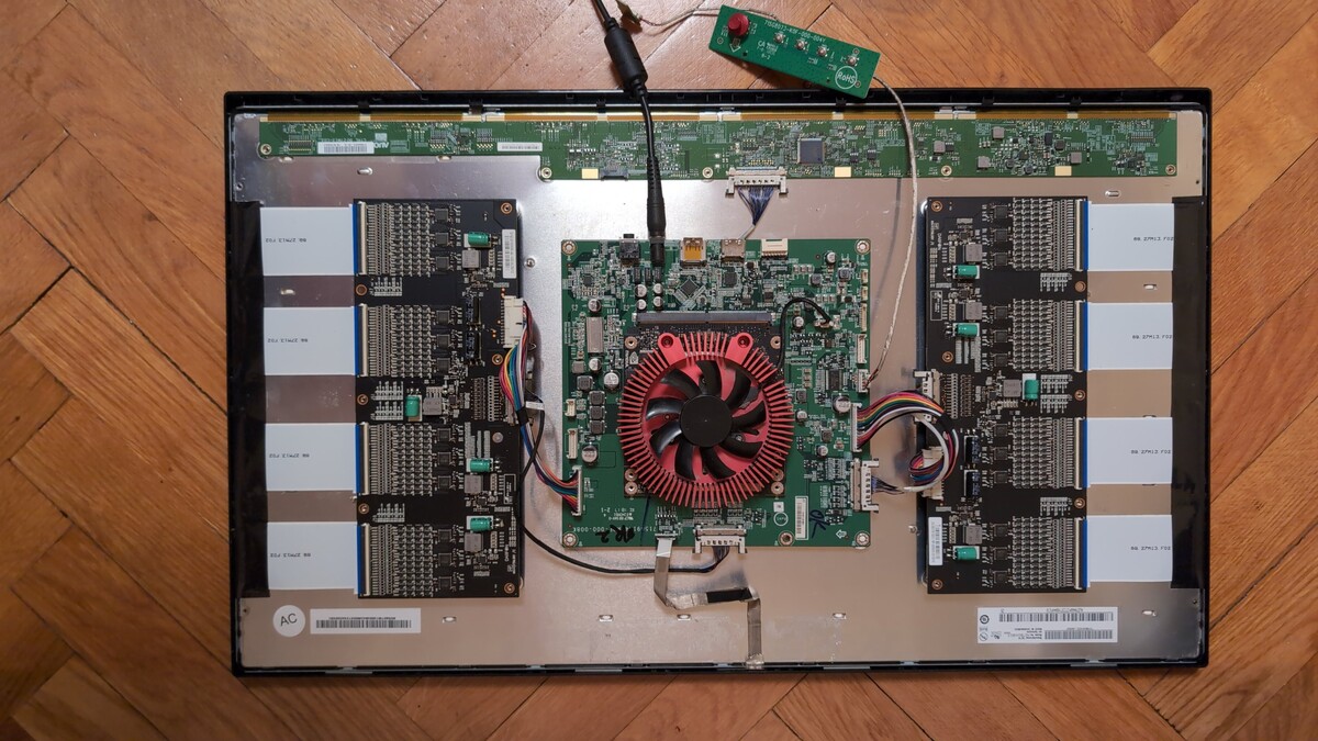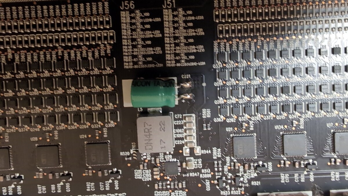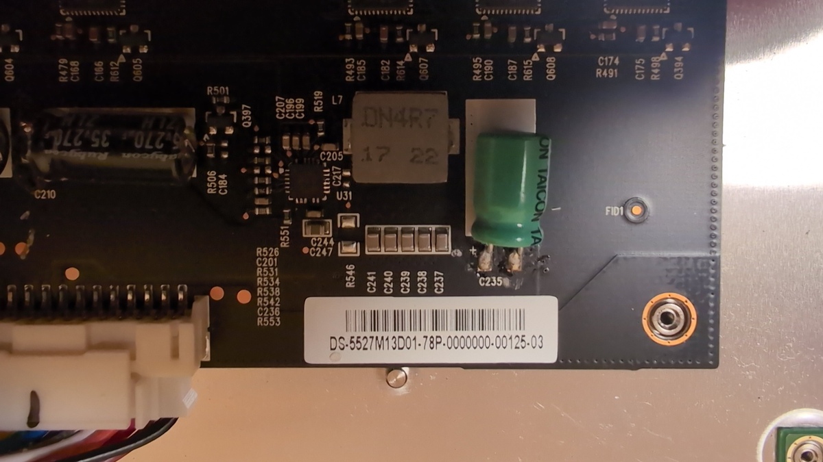 Hi Leute, ich habe seit geraumer Zeit einen defekten Monitor (ehemals sehr teuer) herumliegen und mir nun mal ein Herz gefasst und diesen zerlegt. https://geizhals.de/acer-predator-x27bmiiphzx-um-hx0ee-009-a1615513.html Wissenswertes: - der Monitor hat FALD (Full Array Local Dimming) - der Monitor besitzt ein externes Netzteil (19,5V / 9A), Multimeter sagt 19,5V am Stecker, der zum Monitor geht - alle meiner Meinung nach nicht benötigten Bauteile habe ich entfernt (USB Board, Lautsprecher, Minilüfter neben den Lautsprechern, RGB Krahm) Symptome: - der Monitor geht nur sporadisch an, wenn der Stromstecker in den Monitor gesteckt wird, oftmals tut sich gar nichts und wenn, dann leuchtet die LED vom Monitor und der Lüfter vom G-Sync Modul geht an. Das G-Sync Modul (die Steckkarte mit dem Roten Kühler drauf) hat zwei LEDs, "DS1" leuchtet grün, "DS2" leuchtet rot. Ein Bild zeigt er aber nicht, weder mit noch ohne angeschlossenes Gerät. Weitere Beobachtungen: Bei einem Kondensator sehen die Beinchen etwas korrodiert aus, kann mich aber auch täuschen.. Die anderen glänzen jedenfalls, habe mal zwei Fotos zum Vergleich angehängt. Leider kann ich sonst nichts offensichtliches auf den Platinen erkennen.. Bin leider kein Experte und jetzt etwas ratlos wie es weiter geht.. Danke euch für eure Tipps!