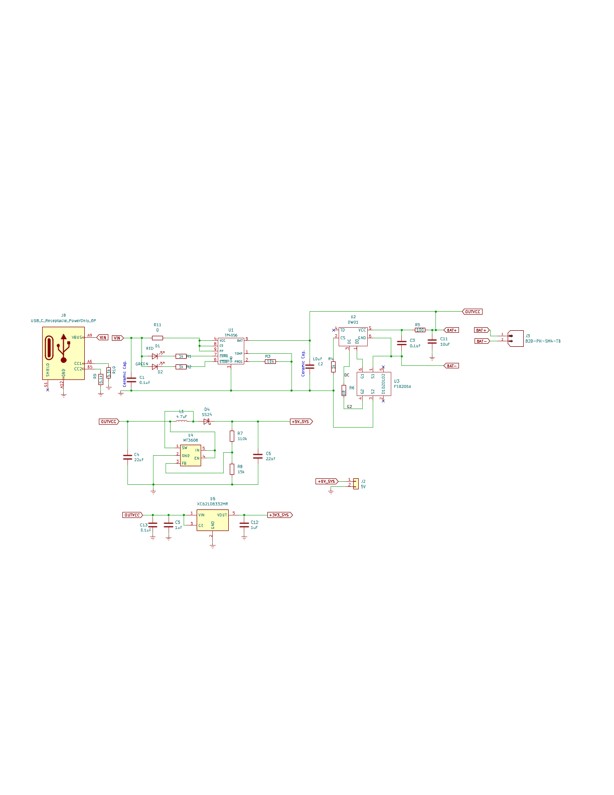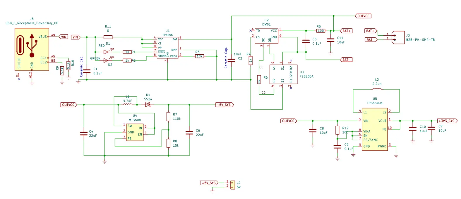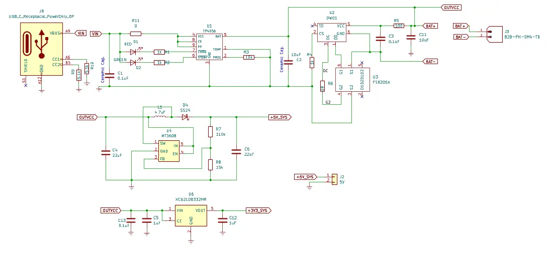 Hallo zusammen,ich plane derzeit eine Stromversorgung für ein Mikrocontroller-Projekt (ESP32C3 super Mini lipo Versorgung)und würde mich über einen kurzen Blick auf den Schaltplan freuen.Eckdaten:Versorgung über USB-C (CC-Pins sind mit 5.1k abgeschlossen).Akku-Ladung via TP4056, Schutzschaltung über DW01.Systemspannungen: 5V (MT3608) und 3.3V (LD1117).Meine Fragen:LDO Stabilität: Der LD1117 ist ja bekannt dafür, bei Keramikkondensatoren am Ausgang zum Schwingen zu neigen. Reicht hier ein kleiner Serienwiderstand oder sollte ich besser auf Tantal/Elektrolyt setzen?Ladestrom: Aktuell ist der TP4056 auf ca. 130mA konfiguriert (R_{prog} = 10k). Erscheint das sinnvoll oder ist die thermische Last bei 1A (1.2k) auf einem 2-Layer Board erfahrungsgemäß unproblematisch?MT3608: Die Feedback-Widerstände sind für 5.0V berechnet. Gibt es hier Anmerkungen zum Layout des Boost-Konverters bezüglich EMV?Den Schaltplan habe ich als PDF/Bild angehängt. Vielen Dank vorab für konstruktive Kritik!