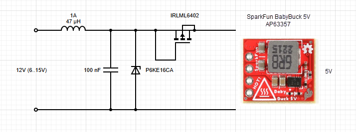 Ich möchte meine Schaltung bestehend aus einem ESP32-C6 (mit zeitweisem Wifi-Betrieb), einem CAN-Transceiver (TJA1050 bzw. TJA1051) sowie einer SD-Card und 2, 3 SMD-LEDs im KFZ betreiben. Die Stromaufnahme aller Komponenten habe ich auf 250 mA im Normalbetrieb und 700 mA Peak zusammenaddiert, mein Netzteil sollte also 1 - 1,5 A liefern können um genug Reserve zu haben. Als Schaltregler habe ich mir einen mit AP63357 rausgesucht, ich wollte eine fertige Platine haben und keine eigene für einen einzigen Prototyp herstellen. Der Regler ist zwar nicht Automotive zertifiziert (evtl. gibt es aber eine Q-Variante?) bewegt sich aber in diesen Parametern (Eingangsspannung 3,8 bis 32 V, hoher Wirkungsgrad, geringer EMI, Unterspannungsschutz, Spitzenstrombegrenzung, thermische Abschaltung, Enable Pin für Powerdown-Mode, 22µA Ruhestrom, niedriger Drop). Laut SparkFun soll er bis 3,5 A liefern können, also mehr als genug Headroom. Damit der Regler auch einen Motorstart überlebt würde ich gern die gezeichnete Schutzschaltung davor anbringen. Die Spule und der Kondensator sollten als LC-Filter gegen Bordnetzstörungen dienen, die TVS Überspannungen (Load-Dump) abfangen und der P-Channel Mosfet als Verpolschutz wirken. Anstelle dem Mosfet könnte ich auch eine Schottky einsetzen. Am Ausgang des Reglers würde ich noch einen 100 µF Kondensator anbringen um die Strompeaks der SD und vom ESP-Wifi abzufangen. Vor dem Eingang der Filterstufe befindet sich auch noch eine Schmelzsicherung (2,5A). (Sorry für den unprofessionelle Schaltplan, ich hatte grad nichts zur Hand)