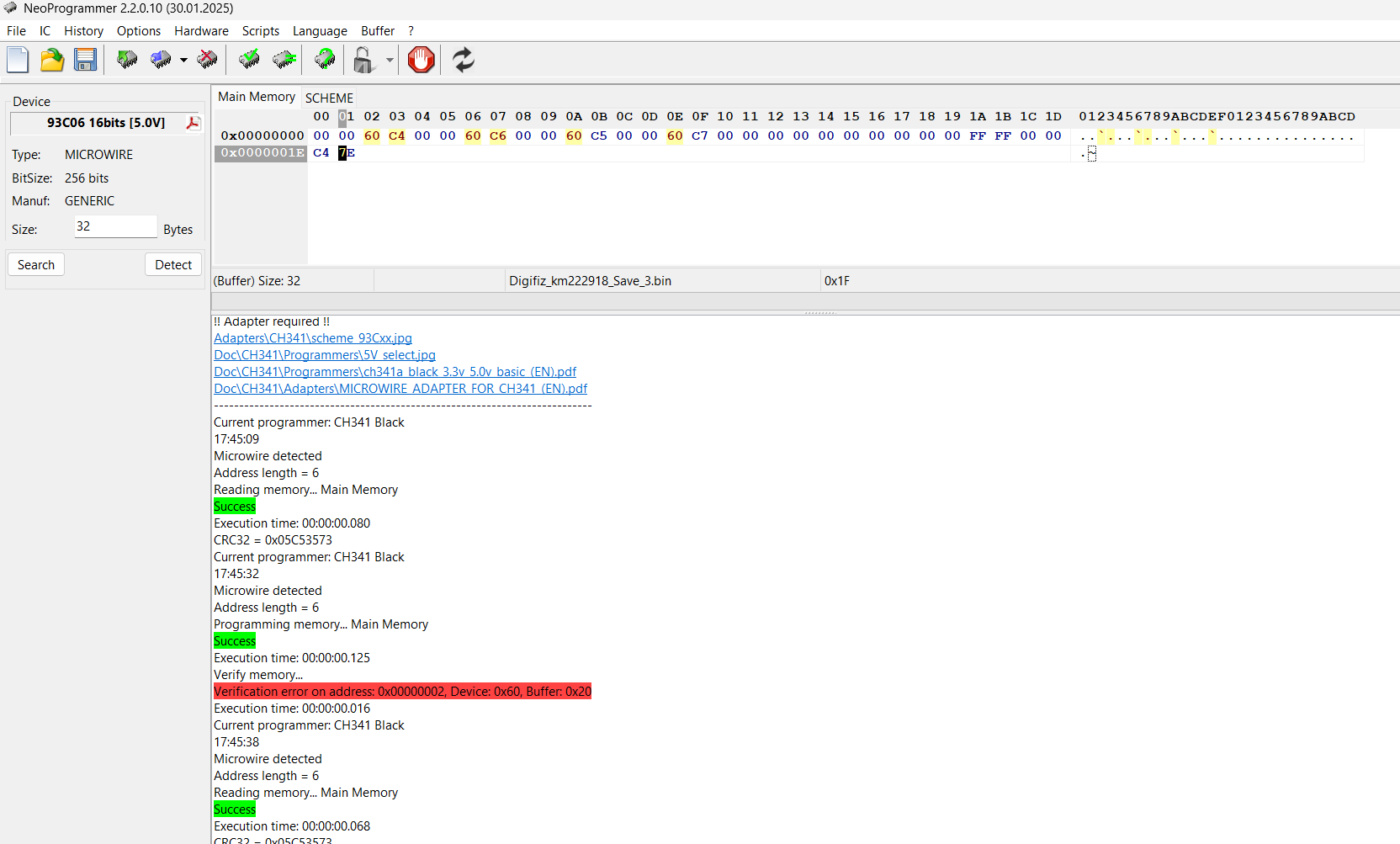 Hallo, ich möchte mit einem Programmer den Kilometerstand an einem VW Digifiz anpassen. Dieser ist auf einem Chip hinterlegt. Es handelt sich um ein NMC9307. Ich kann diesen Chip mit einem CH341A auch auslesen. Nur schreiben funktioniert leider nicht. Gelockt ist dieser wohl auch nicht. Funktionieren muss es weil ich schon mal auf Instagram gesehen habe das jemand den km-stand auf Null gesetzt hat. Ich möchte allerdings einen plausiblen Wert hinterlegen. Ich nutze dafür den NeoProgrammer. Dort ist auch der Chip entsprechend hinterlegt in der Chip Datenbank. Man muss auch einiges umsetzen bevor man den Chip überhaupt auslesen kann. 5V statt 3.3V, Chip auf externer Platine und Verkabelung anpassen usw. Hat jemand hier vielleicht einen Tipp oder einen Hinweis auf einen anderen Programmer. Vielleicht liegt es ja an der Software. Ich weiß jedenfalls nicht mehr weiter.