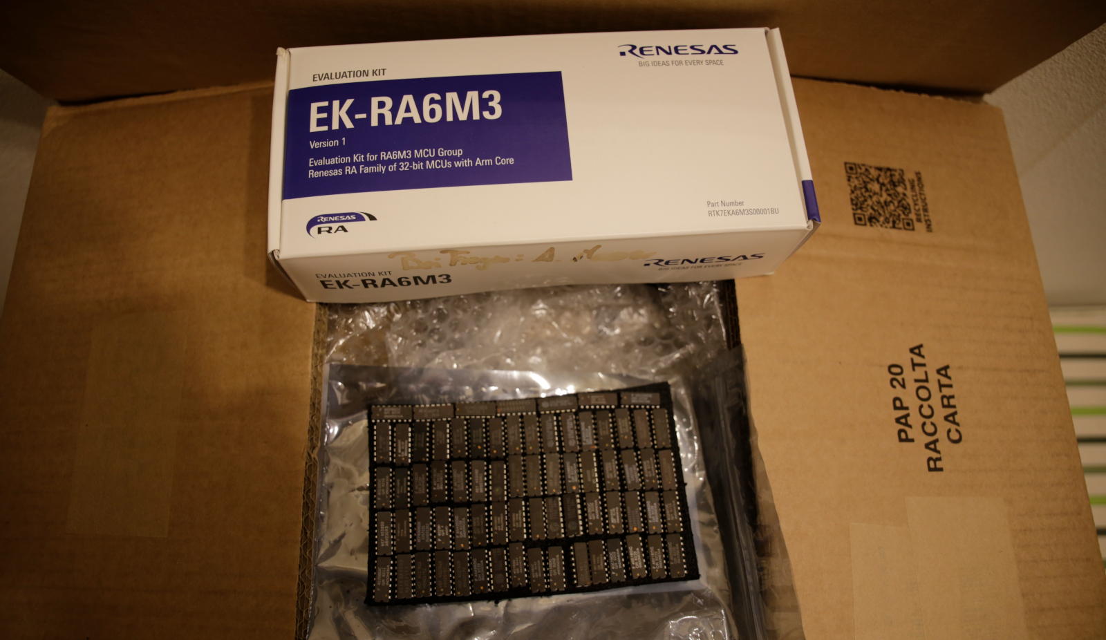 Neben dem allgemeinen Aufräumen habe ich diverse THT Widerstände entnommen. Die von Hinz beigesteuerten Posten hatte ich oben ja schon gezeigt. Ich packe ein Entwicklungskit von Renesas (Ethernet, USB 2.0 Highspeed), sowie eine Auswahl an CMOS ICs dazu. Die Kiste ist wieder recht schwer, also bitte reichlich entnehmen. Die Kiste befindet sich auf dem Weg zu Simon.
