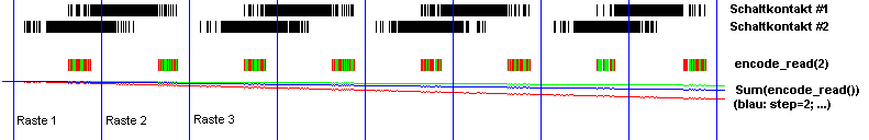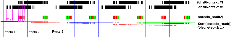 Lothar M. schrieb: > Dann zeichne diese fragliche Stelle und eine Vergleichsstelle mal > deutlich in das Bild ein. Siehe Bild im Anhang. Die Linie in Magenta zeigt die fragliche Stelle und die Linie in Türkis zeigt die aus Anwendersicht relevante Mitte zwischen zwei Rasten. Der Dekoder liefert an der fraglichen Stelle die Position von Raste 2, obwohl diese nicht vorliegt. Lothar M. schrieb: > Offenbar kann man mit "step" die Art der Auswertung beeinflussen: > - 1 Zählerschritt pro komplettem Qadratursignaldurchlauf (00, 01, 11, > 10), > - 2 Zählerschritte pro Signaldurchlauf und > - 4 Zählerschritte pro Signaldurchlauf. In meinem Fall sieht der Anwender zwei Zählerschritte pro Signaldurchlauf. Die anderen beiden gibt es nur für den Entwickler. Peters Dekoder-Software liefert bei realen Kontakten grundsätzlich ein Springen zwischen zwei Zuständen. Wenn sich der Dekoder (bei step=2) so wie von mir erwartet verhalten würde, dann wäre das Ergebnis auch bei realen Kontakten einwandfrei. Der step-Parameter in encode_read() macht für mich keinen Sinn, da er ein Springen der Position nicht verhindert und eine anschließende Korrektur sogar unmöglich macht.