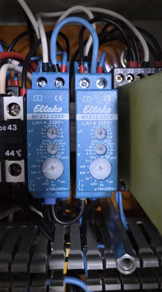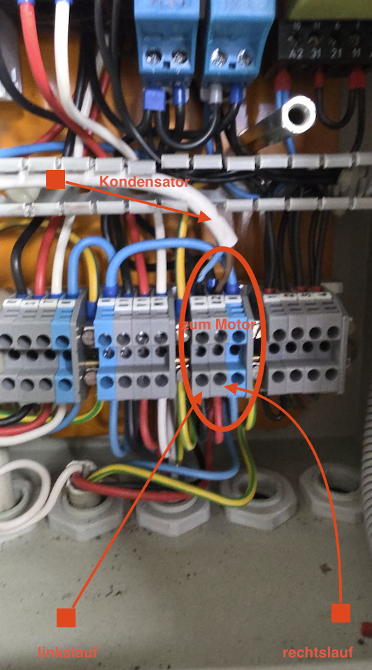 Hallo Zusammen, ich habe eine neue Herausforderung und könnte Expertenrat gut gebrauchen. Es geht um einen 230V Linearantrieb bzw. die Steuerung dazu. Ich habe hier 2 Zisternen und habe die Möglichkeit per Knopfdruck die Zuleitung zwischen den Becken zu steuern. Nur damit in etwas die Funktion klar ist, tut aber nicht wirklich zur Sache. Es ist eine Linerantrieb, der auch so bleiben muss, daher muss ich die Steuerung die plötzlich nicht mehr will instandsetzen. Motor wurde ausgebaut und getestet. Alles funktioniert einwandfrei. Motor dreht in beide Richtungen und Antrieb fährt rein und raus. Im Prinzip ähnlich wie bei einem Torantrieb nur hier in eine andere Funktion. Der Antrieb ist simpel. Der Motor dreht 15 Sekunden links dann fährt die Welle raus und bei „Umpolung“ wieder hinein. Der Motor hat nur 3 ausführende Leitungen ( ist wichtig für der Steuerung) die Wicklungen sind also im Gehäuse bereits verbunden. Ist soweit kein Problem. Tausche ich die Anschlüsse der 2 Wicklungen ( also die beiden Zuleitungen einfach umstecken) wechsele ich die Drehrichtung. Aber der Motor hat keine Endschalter deshalb muss eine Zeitgesteuerte Schaltung das übernehmen. Das hat bisher gut funktioniert, aktuell leider nicht mehr. Anbei paar Bilder Ich benötige eine Wegeleitung wie ich prüfen kann welche der Zeitsteuerungen nicht seine Arbeit verrichtet. Als ultima Ratio eine alternative Lösung mit neuen /anderen Bauteilen. Es soll so einfach wie möglich sein und nach Möglichkeit Preiswert ( leicht erreichbare Bauteile), und schnell realisierbar sein. Auf dem Foto nicht sichtbar gibt es 2 Taster die ( wenn es funktioniert) eben den Motor in eine oder in die andere Richtung drehen lässt. Nach 15 Sekunden schaltet es ab, bis dahin ist die Welle ganz raus oder eben reingefahren. Noch was wenn ich die Sicherung abschalte und wieder einschalte wird der Linke Zeitrelais aktiv und gibt 15 sek Saft frei. Drücke ich die Taste zum UMstellen, wird der rechte Zeitrelais aktiv. Normalerweise könnte ich erneut die andere Taste drücken und damit auf das linke Relais wechseln aber das geht nicht. Nur bei (Sicherung) aus und wieder ein. Es könnte bei der Fehlersuche helfen. Ich vermute der weisse Bauteil steuert etwas anderes (evtl generell Sperre um zu schnell umzuschalten oder vor dem Umschalten sicherzustellen dass nichts falsch läuft) das ist eine wage Vermutung meinerseits. Lasse mich gerne korrigieren. Ich tippe darauf dass der defekt ist, habe aber keine Vorstellung wie ich das prüfen könnte. Ist ziemlich alt das Ding, währed die 2 blauen recht modern sind und und auch zu funktionieren scheinen. Jedenfals wenn die rot leuchten wird auch entsprechend Saft freigegeben. Mal zu einem mal zu anderem ( Leitung zum Motor) Für unkomplizierte Vorschläge bin ich dankbar im voraus.
