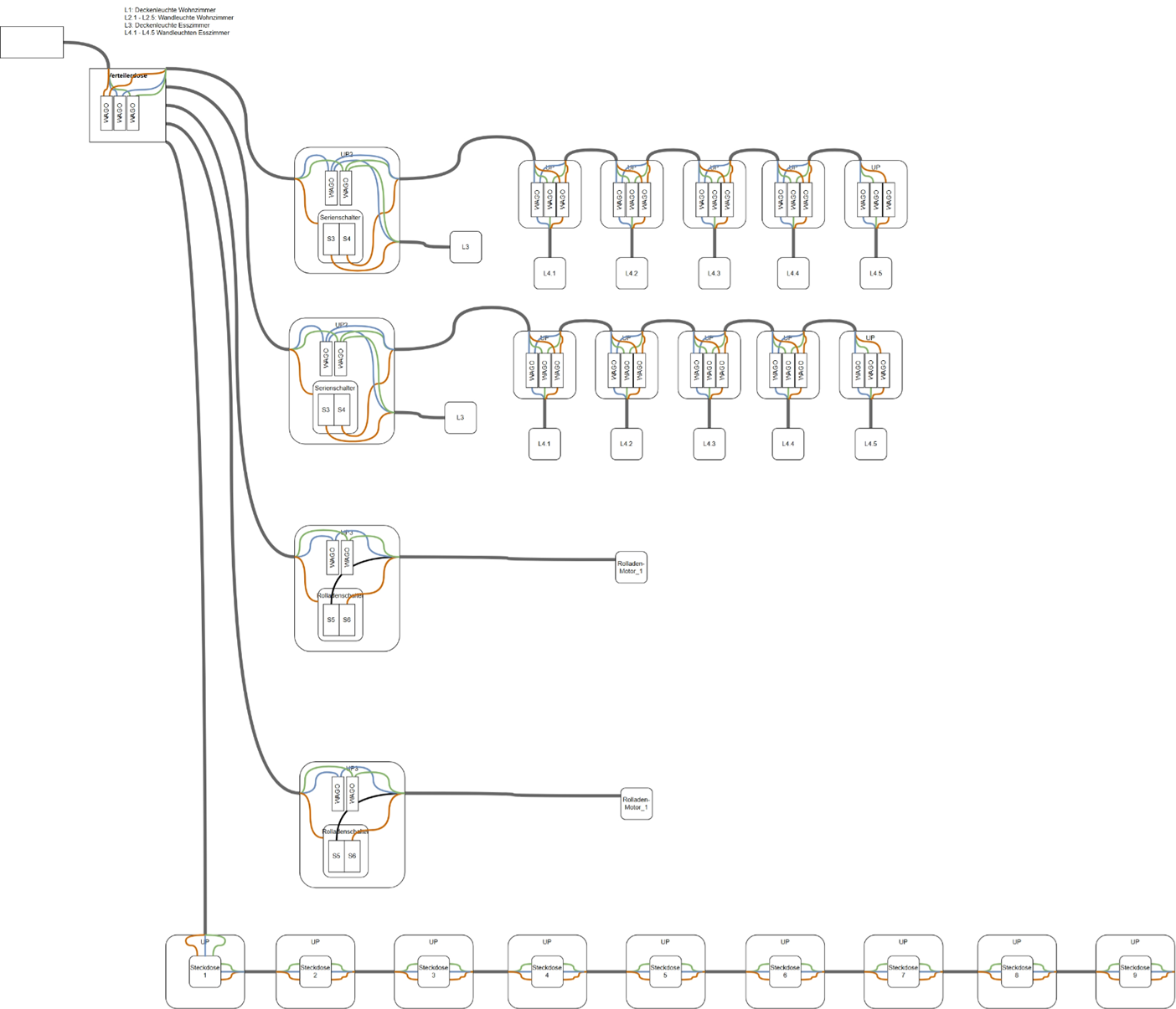 Chandler B. schrieb: > Ist folgende Schaltung so möglich Das schon, ist sie sinnvoll ? 9 Steckdosen hintereinander führt zu 10 Klemmstellen, es ware klüger zumindest die in der Mitte anzufahren und 4 nach links und 4 nach rechts zu legen. Es ist auf jeden Fall klug, an den Lichtschaltern auch N zu haben, macht nicht jeder Elektriker. Und es ist klug, zumindest Licht und Steckdosen getrennt zur Verteilerdose zu fuhren, damit man später beide Stromkreise auftrennen kann. Schutzleiter zur Lampe ist heute Standard. Ob alle 4 Lichtschalter einzeln zur Verteildose müssen oder ihrerseits hintereinander an nur einer Zuführung hängen, hängt von den baulichen Gegebenheiten ab.
