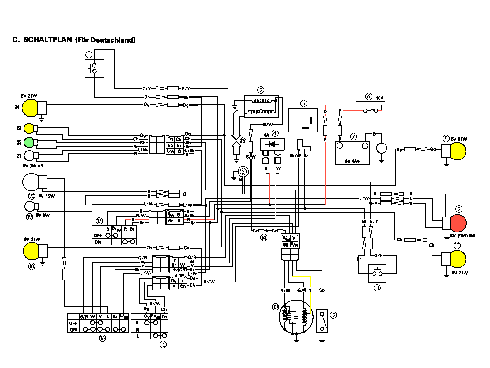 Hallo, ich bastle aktuell an einer DT 175 MX von 81 rum. Problem ist, dass der Kabelbaum zerschnitten wurde und Leitungen nicht zum Schaltplan passen. Versuche also backengineering. Die DT hat eine CDI und kontaktlose Zündung. Auf der Zündgrundplatte (Stator) sind drei Spulen: - Spule 1, größte Spule, Leitungsfarben gelb, blau und schwarz (Masse/Statorgehäuse), Widerstand immer gegen 0 Ohm, Erregerspule? - Spule 2, mittelgroße Spule, Leitungsfarben braun und schwarz (Masse/Statorplatte), 314 Ohm - Spule 3 ist für das Zündsignal, Weiß-rot und schwarz (Masse/Statorplatte), 17 Ohm Mein Problem ist Spule 1. Ich weiß nicht, ob die in Ordnung ist und was davon der Mittelabgriff ist. Spule 2 ist ja vermutlich für das Bordnetz. Kann mir jemand helfen, wie ich vorgehen sollte? Grüße!