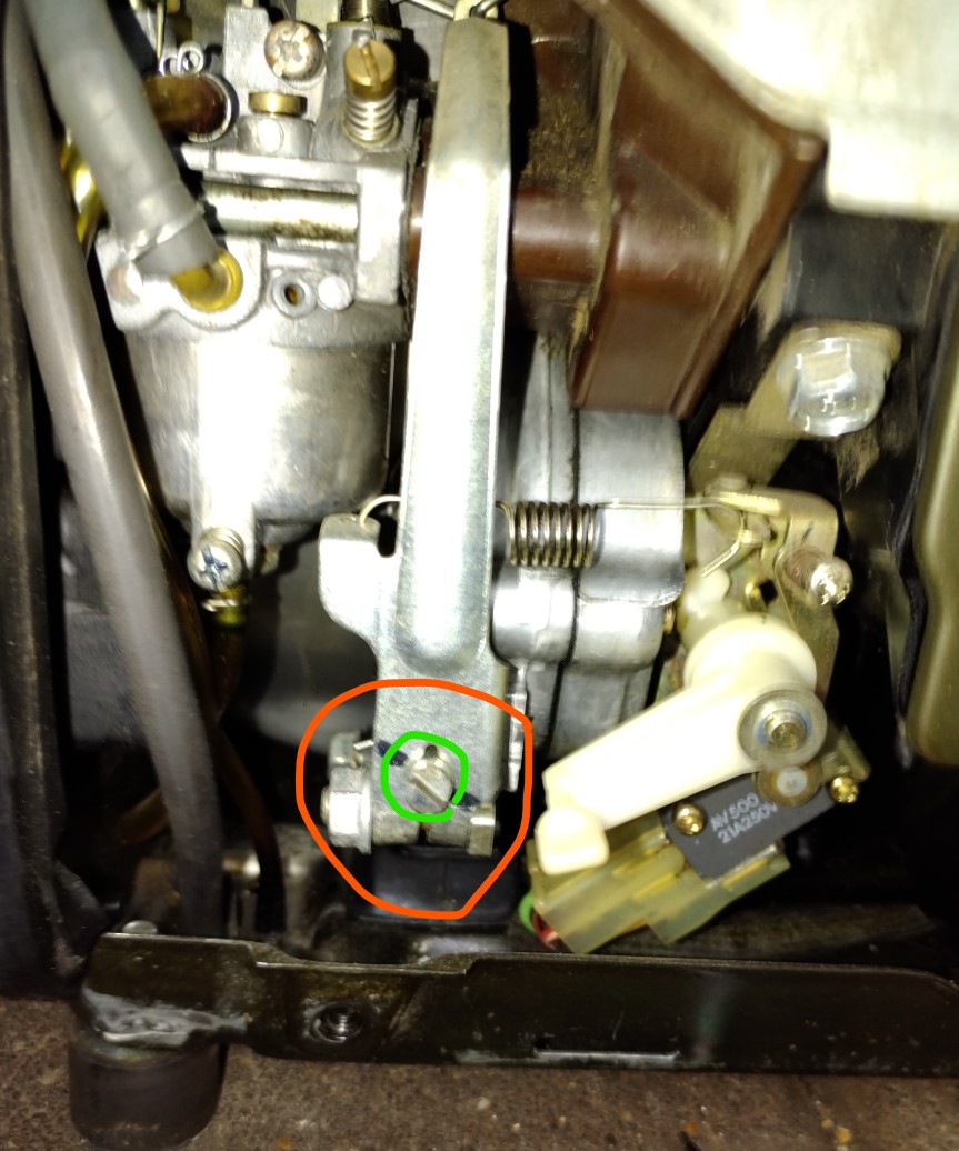 ich hab das Teil wegen der Diskussionen wieder vom Speicher geholt in Inbetrieb genommen. Lief nach zwei Jahren wieder auf den dritten Zug an, mit uraltem Sprit! Grundsätzlich ist das ein rein mechanisches Gebilde das nicht besonders gut regeln kann, es reicht aber für Kleinkram allemal. Warum die Spannung immer wieder ausging, Motor lief weiter, hab ich herausgefunden. Überspannung! Die Mechanische Regelung war so verstellt das der Ausgang immer so bei 280V war und sobald die noch höher steigt, Motor wird wärmer, läuft bissi schneller, ist der Ausgang fast spannungslos, bei einem Rest von 50V ohne Last. Diese Erfahrung hat mich drei 100W Glühbirnen gekostet:-) Man muß die Regelmechanik (siehe Bild) mit etwas Gefühl so einstellen das sie bei einer Last von, bei mir jetzt 150W, 220V erreicht. Beim Umstellen des Hebels von Schildkröte zu Hase wird 235V ausgespuckt. Mein Fehler war: Alles zerlegt, gesäubert, nach Markierung zusammengebaut, aber NICHT eingestellt, die Drehzahleinstellung ist recht empfindlich! Da geht es wohl um Teile von Grad und markieren allein ist zu wenig. Mit einem 10 Schlüssel das rot markierte Klemmdings lockern so das man mit dem Kombizangerl die Welle (grün) verdrehen kann. Das alles im Betrieb mit Last bis 220V messbar sind. (Doppelstecker zum Messen nutzen)