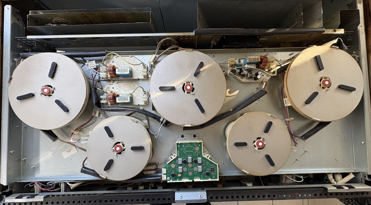Hallo liebe Forengemeinde, ich versuche an dem im Betreff genannten freistehenden Doppelbackofen mit Induktionsfeld eine Reparatur durchzuführen, die lediglich das Induktionsfeld betrifft. Das Gerät ist aus 2009 und ist mit 5 Induktionsheizelementen (IHE) und Elektronik der deutschen Firma EGO ausgestattet. Ich habe das Schaltnetzteil repariert, alle ELKOs erneuert und auf allen Platinen die Relais getauscht. Nun funktionieren 2 IHEs wieder, allerdings stimmt die Zuordnung zu den 7-Segmentanzeigen ebensowenig, wie die Zuordnung zu den frontseitigen Drehreglern. Die anderen IHEs werden melden Fehler E4. Leider gibts offiziell keinerlei Technische Dokumentation. Weiß vielleicht jemand wie ich die IHEs neu anlernen kann? Jegliche Hilfe ist willkommen.