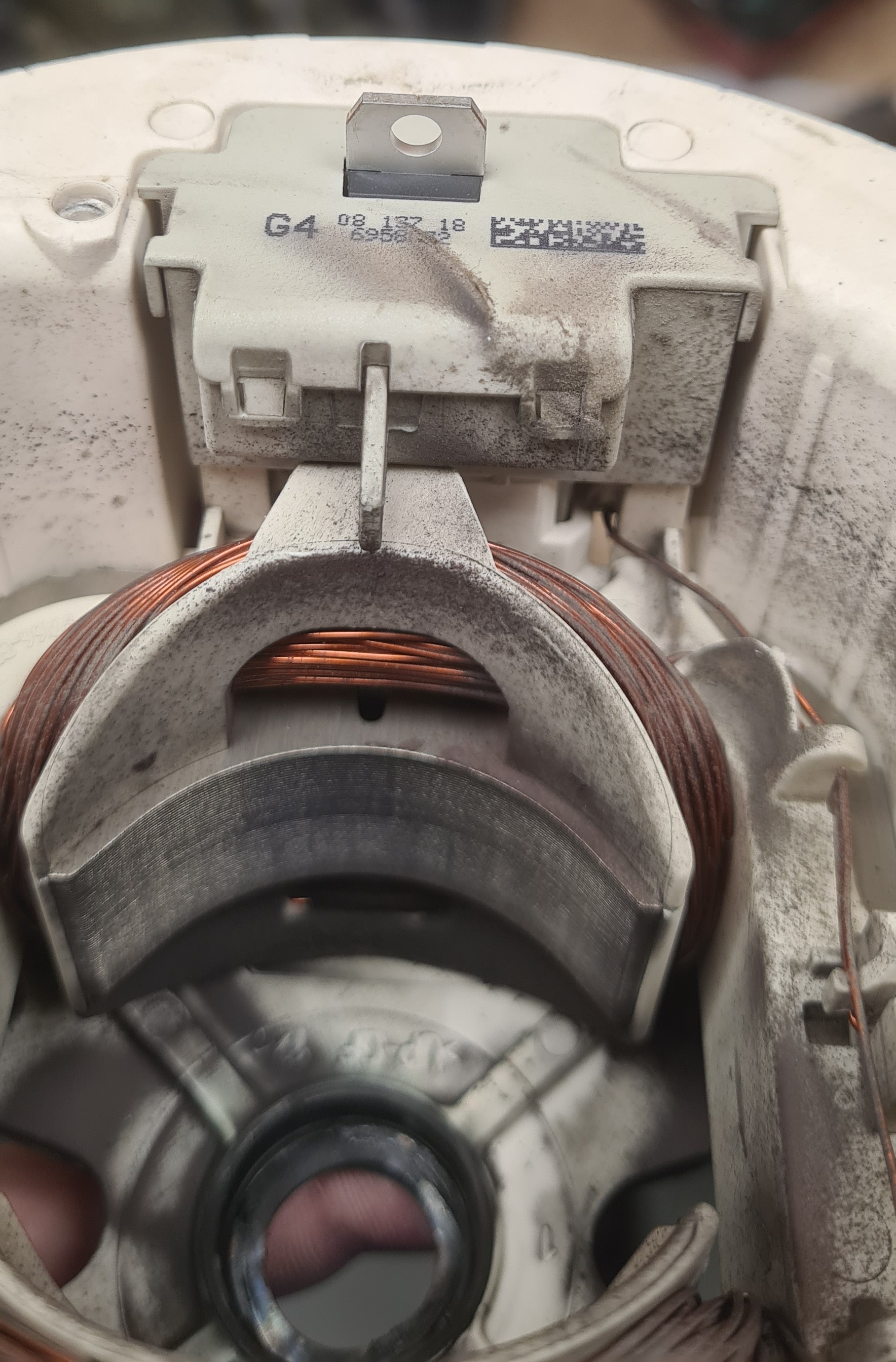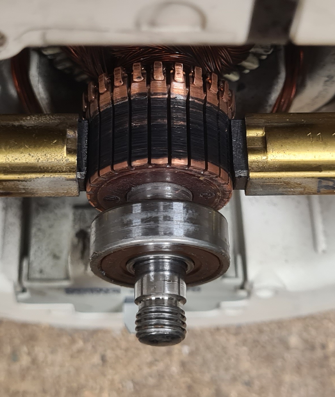 Hallo zusammen, es ist das zweite Mal in den vier Jahren, die ich das Gerät habe, dass es hinüber ist. Vor gut zwei Jahren habe ich die Kugellager tauschen müssen, weil die originalen komplett durch waren. Nachdem der Motor recht auffällige Geräusche machte, und auch im Nachlauf ungesund war, habe ich schon wieder einen kapitalen Lagerschaden feststellen dürfen. Ärgerlich, denn das sind recht teure Speziallager. Auffallend war vor allem, dass der Motor stark nach Bürstenfeuer gerochen hat. Auch diesmal zeigte der Motor enorm viel Kohlenabrieb im Gehäuse (war alles mehr oder minder schwarz). Hab die Lager gewechselt und den ziemlich eingelaufenen Kollektor geglättet und anschließend mit 800er Schleifpapier "poliert". Die Kohlen habe ich gelassen, denn die sind weicher als Kupfer und sollten sich selbst an die neue Oberfläche angleichen. Sie sahen auch nicht wild aus. Alle Wicklungen am Rotor haben zwischen 3,93 und 4,08 Ohm. Das Kupfer zeigt keine Verfärbungen, weshalb ich erstmal davon ausging, dass die Wicklungen i.O. sind. Um den neuen Motor nicht gleich zu überfordern, und die Kohlen einzuschleifen, habe ich den Staubsauger am Stelltrafo betrieben. Der Motor lief bei guten 40V an, klang typisch, kein besonderes Bürstenfeuer. Hab dann langsam auf 230V erhöht, wobei der Motor erstmal keine Besonderheiten zeigten. Auffällig war nur, dass ab 180V das Bürstenfeuer deutlich zu riechen war. Ich hab den Motor so ein paar Minuten laufen lassen (im dunklen) und gesehen, dass das Bürstenfeuer immer mehr wurde und der Geruch auch deutlicher wurde. Hab dann nochmal probiert, ab welcher Spannung der Motor anläuft und da waren es dann schon 140V. Also den Motor nochmal zerlegt, und den Kollektor so vorgefunden (siehe Bilder). Mir kommt das ausgesprochen spanisch vor. Einerseits die deutlichen Riefen im Kupfer (die vorher nicht da waren), der deutlich schlechtere Anlauf, und natürlich die Tatsache, dass der Kollektor schwarz ist. Eigentlich ist für mich der Staubsauger abgeschrieben, weil Miele mittlerweile absoluter Rotz geworden ist und mich das Teil seit langem aufregt. Es ist ein rein akademisches Interesse, das Teil wieder zum Laufen zu bekommen. PS: Ja, die Bilder sind groß und das ist absicht.