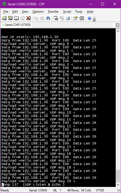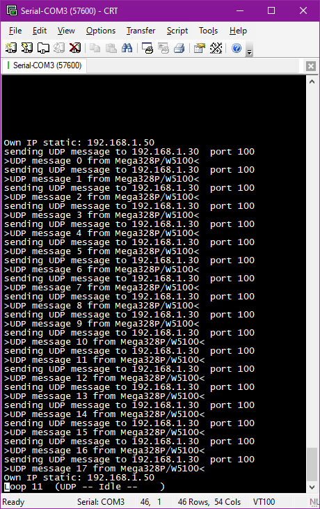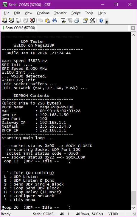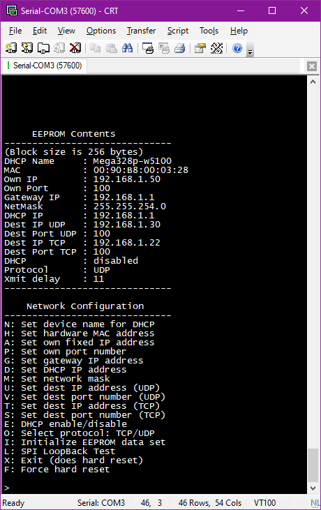 Interessiert das hier jemanden? Ich versuch es einmal .... es kann ggf. noch einiges mehr kommen. Kleine Mikrocontroller haben keinen eingebauten MAC und sind damit erst mal nicht einfach ethernet-fähig, Aber es gibt ja die Ethernet/TCP- Controller von WizNet die einem das Anbinden von kleinen Controllern ans Heimnetzwerk ermöglichen. Hier ein Testprogramm für Arduino Uno und dem Wiznet W5100 (Arduino-) Shield. Genauer genommen für einen Mega328P mit angeschlossenem W5100. Man kann damit UDP Daten testweise senden und empfangen. Weiterhin kann man alle Konfigurationsdaten im EEPROM speichern und damit ohne Tipparbeit mühelos auf seine eigene Konfiguration zurückgreifen. Das Programm enthält keinen Arduino-Code, Arduino ist nur die Hardware- Basis für die eigene Kreation. Zum Betrieb braucht man ein Terminal-Programm mit VT100-Fähigkeit. Im folgenden Beitrag wird das Programm gepostet.