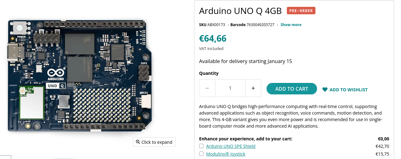 Wer den auf Qualcomm-Technologie basierenden Arduino Uno Q sofort erwerben wollte, musste sich bisher mit der 2GB-Version zufriedengeben. Nun gilt, dass die besser ausgestattete Variante unter der SKU ABX00173 in Vorbestellung ist – ihre 4GB RAM sind insbesondere bei der Arbeit mit Linuxapplikationen wertvoll.