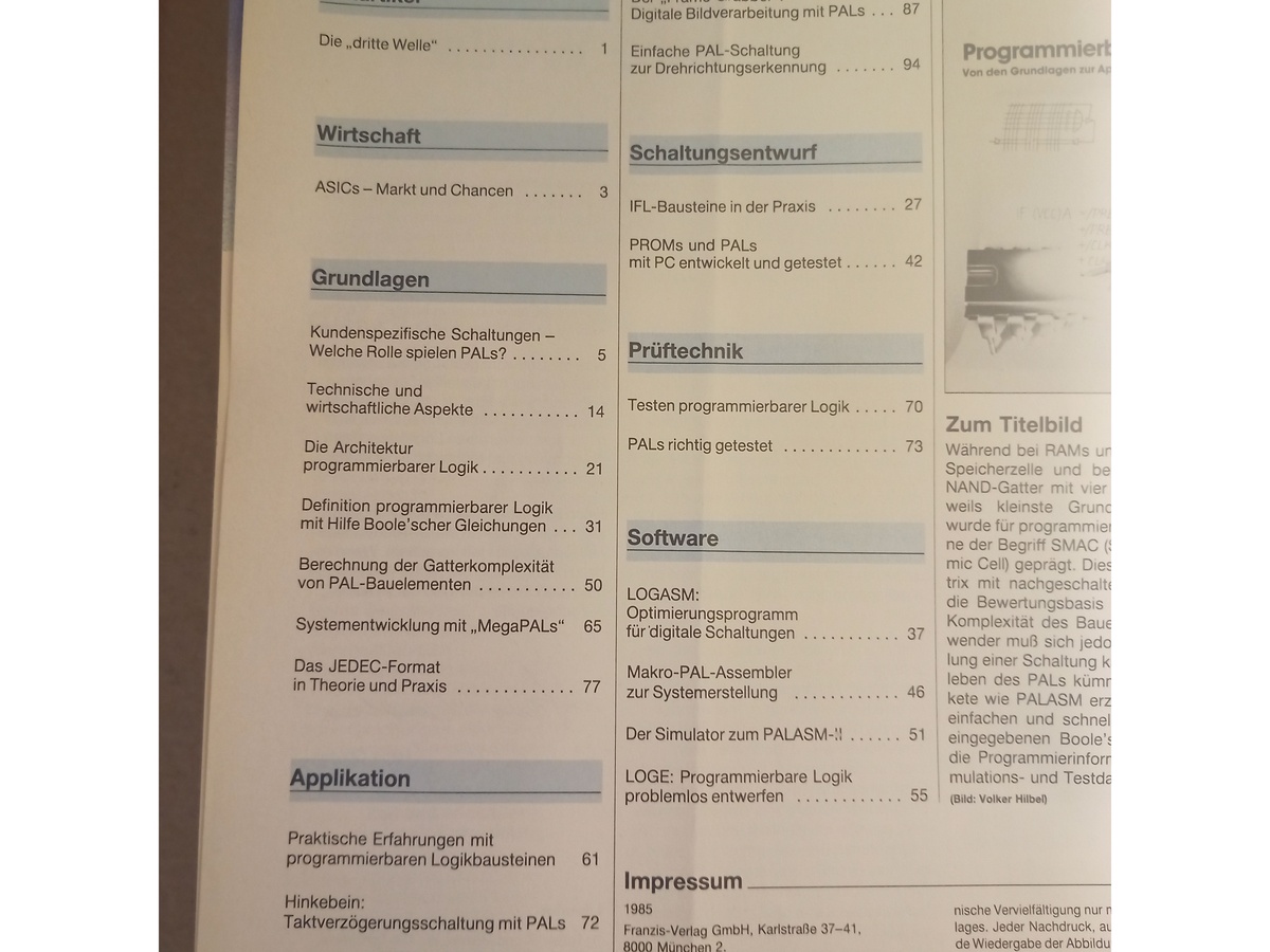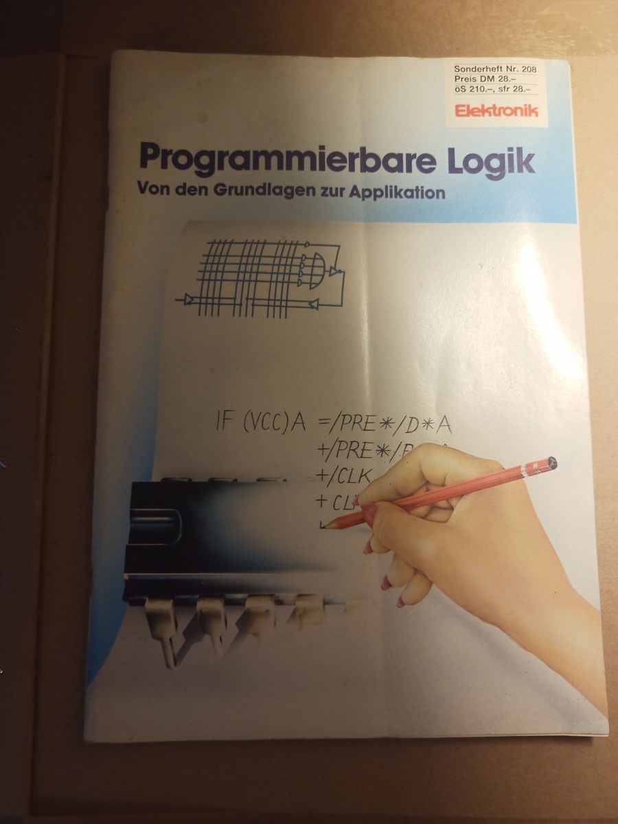 Beim Rumsuchen bin ich über das Heft "Programmierbare Logik" gestolpert. Es ist das Sonderheft Nr. 208 der Zeitschrift Elektronik von 1985. Das ist Antiqariat! Nix mit FPGA. Sondern ASIC und PAL. Also eher was für historisch Interessierte. Sind aber auch paar Schaltungen dabei. Schaut ins Inhaltsverzeichnis. Das Heft hat 98 Seiten und ist schon etwas lädiert. Bevor ich das ins Altpapier gebe, steck ich es lieber in ein Kuvert, solang mir der neue Besitzer das Porto zahlt und mir zusichtert, dass er sich darüber freut. :-) Bild vergessen ...