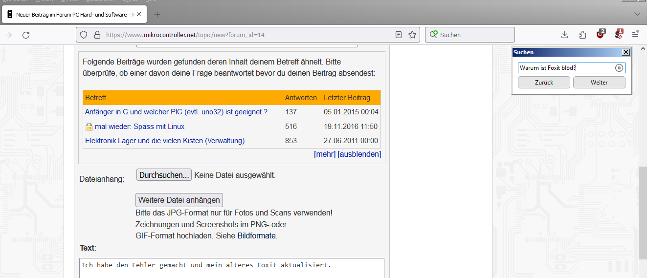 Ich habe den Fehler gemacht und mein älteres Foxit aktualisiert. Seitdem erscheint mit Strg-F ein extra Suchfenster, das vollkommen unpraktisch und unsinnig ist. Als Krönung des Ganzen bekommt man beim Zurückwechseln mit Alt-Tab aus einer anderen Anwendung nur dieses Suchfenster ohne Foxit dazu, siehe Anhang. In dem Menü mit den Taskbildchen (die Auswahl bei Alt-Tab) erscheint es mit einem eigenen Symbol und "Suchen" (ohne Programmname), in der Taskleiste allerdings nicht. Eine Inkonsistenz, die mir eher auf einen Fehler hindeutet, weil man unbedingt irgendwas anders machen wollte um die Leute zu ärgern. Wie kann man das abschalten und wieder auf den sinnvollen früheren Zustand zurückführen, daß das Suchfeld im Programm bleibt? Mit Alt-Q bekommt man zwar ein Suchfeld im Foxit, aber sobald man mit Enter tatsächlich sucht, springt auch das zu einem neuen Fenster auf.