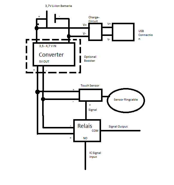 Anbei der Schaltplan. Die Batterie wird direkt vom USB-Stecker geladen. Der Converter ist für die benötigten 5V vom Relais drin. Ich werde es aber gleich noch ohne versuchen. Wenn der Sensor 3S gedrückt anspricht, geht die Lampe an / aus. Bei einem kürzerem Impuls schaltet der Modus um. Edit: Auch ohne Converter ist das Problem das gleiche. Bei Berührung der GND am Ladeport bewirkt ein schalten.