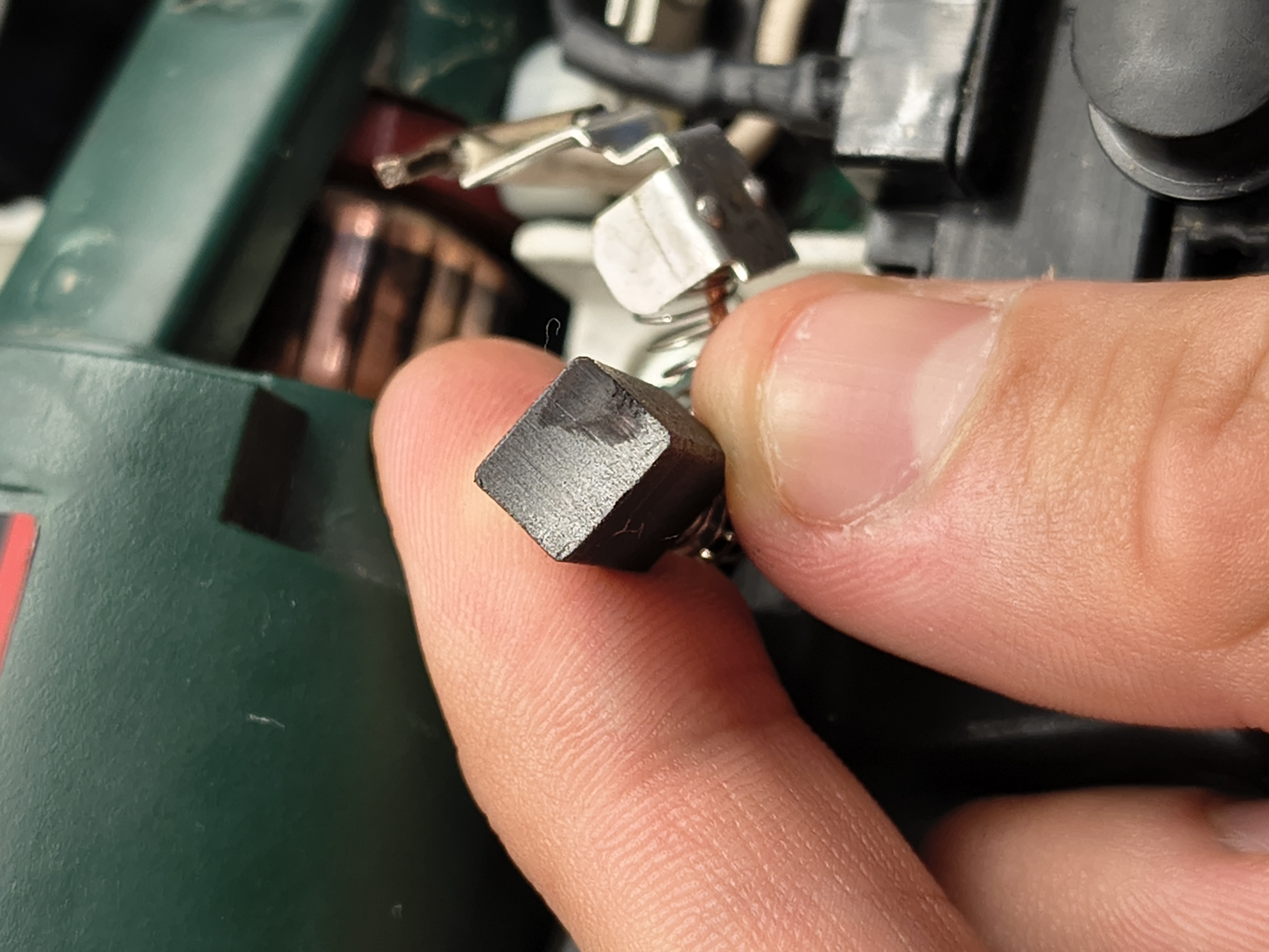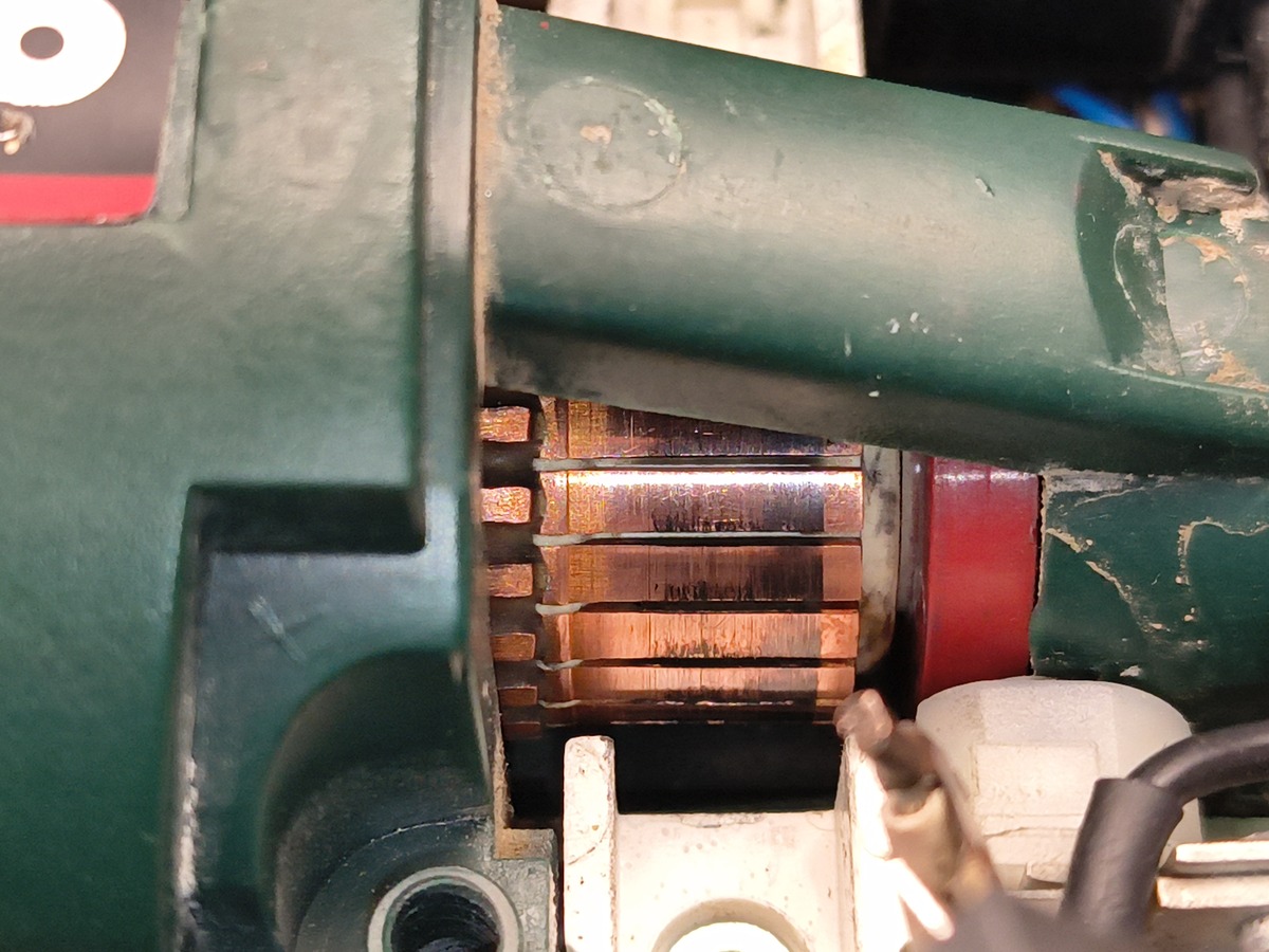 Ich versuche momentan eine ältere Bohrmaschine zu reparieren. Sie lief von einem Tag auf den anderen nicht mehr und wie sich herausstellte, war ein Schleifkontakt im Hauptschalter abgebrochen. Den kleinen Kupferkontakt habe ich ersetzt und nun läuft die Maschine wieder, allerdings vom Gefühl her nicht mit maximaler Drehzahl. Als ich die Maschine nach der Reparatur des Schalters das erste Mal ausprobierte, lief sie nur sehr langsam an und hatte starkes Bürstenfeuer in beide Laufrichtungen. Wieder auseinandergebaut sah man, dass der Kollektor komplett grau war und die Bürsten große Ausbrüche hatten. Mutmaßlich habe ich beim ersten Ausprobieren die Bürsten falschrum wiedereingebaut, sodass sie nicht mehr perfekt passten. Ich habe dann mangels Drehbank den Kollektor abgeschliffen (600er Schleifpapier um den Rotor gewickelt und gedreht) und die Bürsten neu eingeschliffen (600er Schleifpapier um den Kollektor gewickelt, mit Tesafilm festgeklebt und im zusammengebauten Zustand in eine Richtung gedreht). Danach lief die Maschine etwas schneller und hatte kaum noch sichtbares Bürstenfeuer, aber für mein Gefühl ist sie immer noch zu langsam. Zum Beispiel scheint sie auf niedrigster und schnellster Stufe gleich schnell zu sein. Die drei angehängten Bilder zeigen die Kohlen und Kollektor nach meinem Einschliffversuch. Die Maschine ist zu dem Zeitpunkt des Fotos eine Minute gelaufen und die grauen Spuren auf dem Kollektor werden schlimmer, je länger sie läuft. Wie sind die Spuren auf dem Kollektor und den Kohlen zu interpretieren? Sind die dunkleren Stellen mit gutem oder schlechtem Kontakt? Was habe ich beim Einschleifen falsch gemacht? PS: Bei dem Gerät handelt es sich um eine Metabo-Bohrmaschine mit Universalmotor und "Vollwellenelektronik" und Drehzahlmessung über magnetischen Sensor. Dass die geringe Drehzahl an etwas anderem als den Kohlen liegt, halte ich für unwahrscheinlich. Der Hauptschalter hat einen Widerstand zwischen 6 kOhm und 49 kOhm je nach Stellung; klingt erst mal plausibel. Das Poti für die Drehzahlwahl hat 1,2 Ohm bei maximaler Einstellung und 11,3 kOhm bei minimaler Einstellung; scheint also auch in Ordnung zu sein. Die Rotorwicklungen haben alle 0,7 Ohm zwischen nebeneinanderliegenden Lamellen, kein Dreck zwischen den Lamellen, Lamellenisolation ist tief genug, etc.