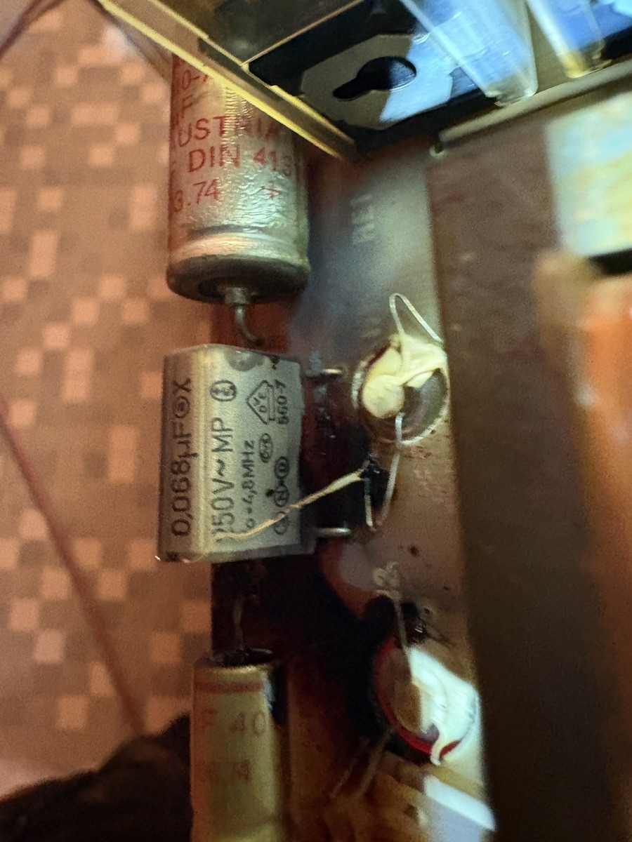 Komisch ist, dass die Suppe nicht der Schwerkraft folgend nach unten Richtung Trafo gelaufen ist. War die Platine länger ausgebaut herumgelegen? Was ist das für ein Faden am Kondensator, Insektenreste?
