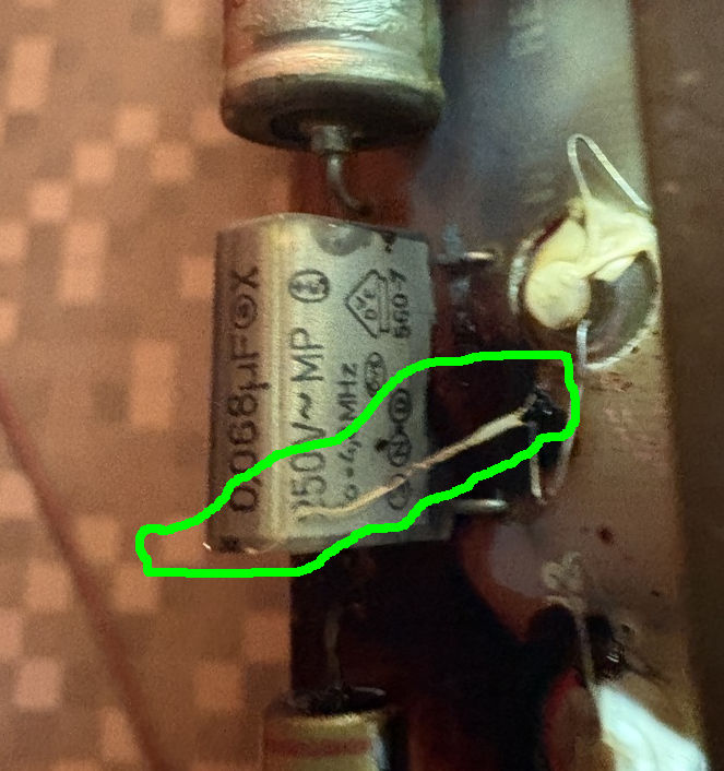 Nix Schwerkraft, die Suppe wurde vom Kondensator ausgeblasen und ist dann kleben geblieben. Der Faden ist vom Montagekleber der Glimmlampen. Kondensator gibt's für kleines Geld neu, z.B.: https://www.kessler-electronic.de/de/R46-68NF