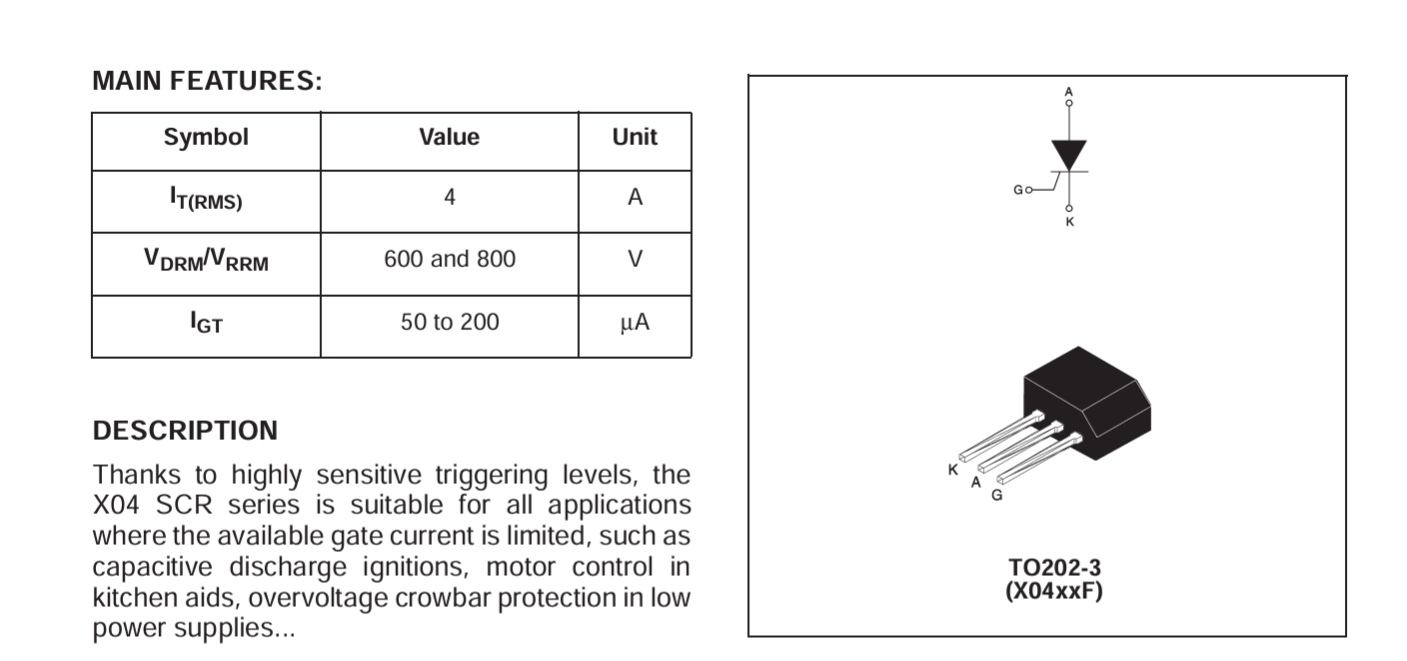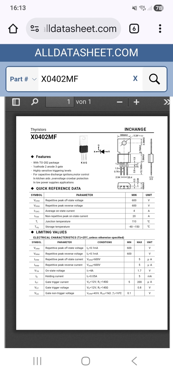 Der Thyristor ist bekannter unter der Bezeichnung Z0402 und benötigt nur sehr wenig Zündstrom, nämlich 3mA. Laststrom bis zu 4A.