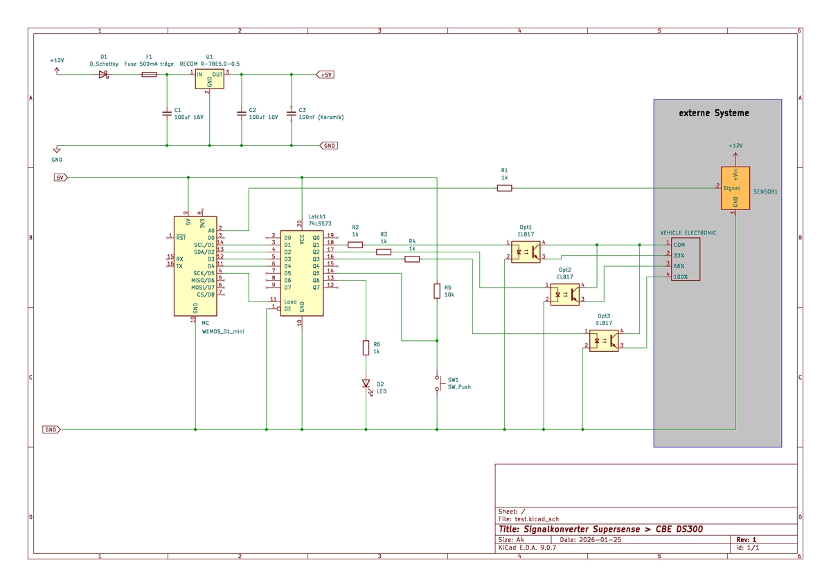 Hallo zusammen, ich habe mir ein Projekt vorgenommen und da meine Elektronik-Kenntnisse etwas eingestaubt sind (da ich schon sehr sehr lang nichts derartiges mehr gemacht habe), bitte ich euch um Review einer kleinen Schaltung. Eine kurze Beschreibung, was eigentlich gemacht werden soll: In einem Wohnmobil soll der bestehende Sensor für den Füllstand des Wassertanks durch einen neuen Sensor getauscht werden. Der bisherige Sensor von CBE 505145KN ist ein sog. 4-Stab-Sensor. Dabei ist ein Stab COM und die anderen drei liefern die Signale für drei feste Füllstände (33%, 66%, 100%, und leer gibts auch noch). Der Sensor liefert auf drei Drähten eine Spannung gegen COM, wenn der zugehörige Stab im Wasser steht. Dieser Sensor ist über eine sog. Distribution-Box (CBE DS300) mit einem Anzeige-Panel (CBE PC110) verbunden. Der neue Sensor liefert ein analoges Signal für den Füllstand (0V = leer, 2,5V = voll). Um diesen Sensor an die DS300 und PC110 anschließen zu können wird ein Konverter für das Analogsignal benötigt. Und genau dieser soll erstellt werden. Grundsätzlich soll der Konverter mit einem Microcontroller (Wemos D1 Mini) realisiert werden. Zum Betrieb des MC wird zunächst eine Spannungsversorgung benötigt. Im Wohnmobil stehen 12V Batteriespannung zur Verfügung. Da der MC mit 5V läuft, wird ein Spannungskonverter von 12V auf 5V erstellt. Dafür ist eine (Teil-)Schaltung im Schaltplan enthalten. Die Spannungskonvertierung wird mit einem RECOM R-78E5.0-0.5 gemacht (Ausgang: 5V fest, 500mA). Aussen rum sind ein paar Kondensatoren zur Spannungsglättung und Ausgangsentkopplung vorgesehen. Bitte schaut euch das mal an, ob das passt. Der eigentliche Signalkonverter besteht aus - dem Wemos D1 Mini, - einem Latch 74HC573 Latch damit der MC in den deep sleep gehen kann und die Ausgangs-Signale erhalten bleiben - und pro Signal einem Optokoppler zur galvanischen Entkopplung - einem Teach-Taster um die analoge Spannung anzulernen, wann welches Signal geschaltet werden soll - einer Status LED die mir per Blinksignal den Zustand des MC angibt Bitte seht euch die Schaltung an. Brauche ich die Widerstände bzw. sind die Werte i.O.. Fehlt was? Ich hoffe ich konnte es halbwegs beschreiben, was ich machen will. Ansonsten einfach fragen. Ich danke euch schon mal. Grüße Bernd
