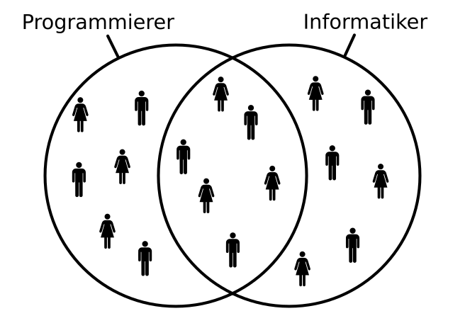 Niklas G. schrieb: > Yalu X. schrieb: >> Ein Informatiker würde die letzten beiden Zeilen noch vereinfachen: > > Man kann es auch noch anders schreiben, aber manchmal ist die längere > Schreibweise verständlicher bzw. macht explizit klar, was gesagt werden > soll. Für mich ist ehrlich gesagt die vereinfachte Schreibweise verständlicher und expliziter, denn da steht, in Prosa geschrieben: "Es gibt Programmierer, die keine Informatiker sind." bzw. "Es gibt Informatiker, die keine Programmierer sind." Deine Zeilen würde ich lesen als: "Es gibt Programmierer, die nicht sowohl Programmierer als auch Informatiker sind." bzw. "Es gibt Informatiker, die nicht sowohl Programmierer als auch Informatiker sind." Dass ich das so sehe, kann aber daran liegen, dass ich Informatiker bin. Man kann den Sachverhalt aber auch sehr schön mit einem Mengendiagramm verdeutlichen (s. Anhang).