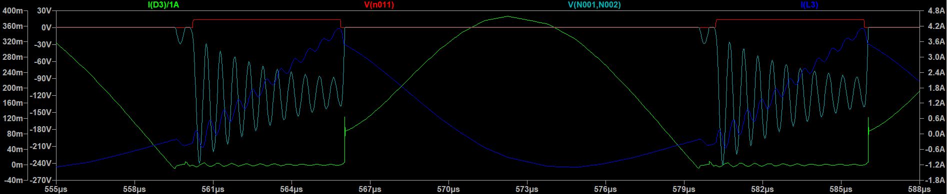 Mark S. schrieb: > bzw mal einen kompletten passiven snubber installieren. Ist ja nun kein > Hexenwerk über das man tagelang dikutieren muss. Den habe ich doch sobald ich den active clamp ausschalte und einen Widerstand parallel zum Kondensator schalte, oder nicht? Die Diode ist die Body-Diode, Kondensator ist sowieso vorhanden, fehlt nur der Widerstand. Klaus R. schrieb: > Was sagt denn LTspice dazu? Das es diese Schwingungen zwar gibt, allerdings bei weitem nicht so dramatisch wie in echt. So wäre das ganze auch noch okay, hat nur mit der Realität leider nur bedingt was zu tun. Es fehlen komplett die Schwingungen die ich sehe wenn der Sekundärstrom auf 0 abfällt. Auf dem Oszilloskopbildern kann man sehen, dass bei geringerer Schaltfrequenz zum einen die typischen DCM-Schwingungen auftauchen, und dann nochmal beim Einschalten des FET das ganze angeregt wird. Ein Kästchen entspricht 10uS, die Frequenz ist nun also 15 kHz anstelle von 50 kHz. Wenn ich anfange die Schaltfrequenz zu erhöhen (bei gleichbleibender Einschaltdauer), etwa auf 20 kHz, dann werden die Schwingungen wieder extremer. Sieht so ein bisschen so aus, als ob ich dem schwingenden System durch das Einschalten dann einmal nochmal richtig Energie rein gebe wodurch es noch mehr schwingt.