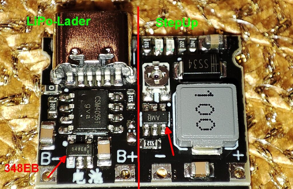 Hallo, auf einem LiPo-Lader, kombiniert mit einem StepUp-Regler finde ich zwei ICs, zu denen ich erstmal nichts finde. Der 348EB (kann auch 348E8 sein) kann eigentlich nur ein LiPo-Schutz sein, leider sind die Leiterbahnen in diesem Schwarz nicht wirklich zu sehen (ja, kann ich durchklingeln). Der Andere kann nur das StepUp-IC sein, finde aber auch kein Datenblatt dazu. Old-Papa