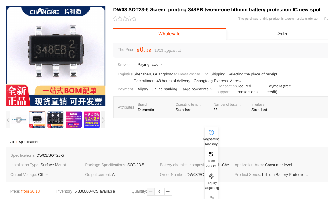 https://detail.1688.com/offer/692492724632.html DW03 SOT23-5 Screen printing 348EB two-in-one lithium battery protection IC Wann mir Firefox eine Übersetzung anbiete habe ich noch nicht herausgefunden, hier jedenfalls das Ergebnis