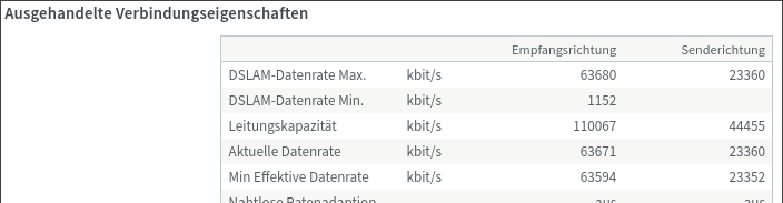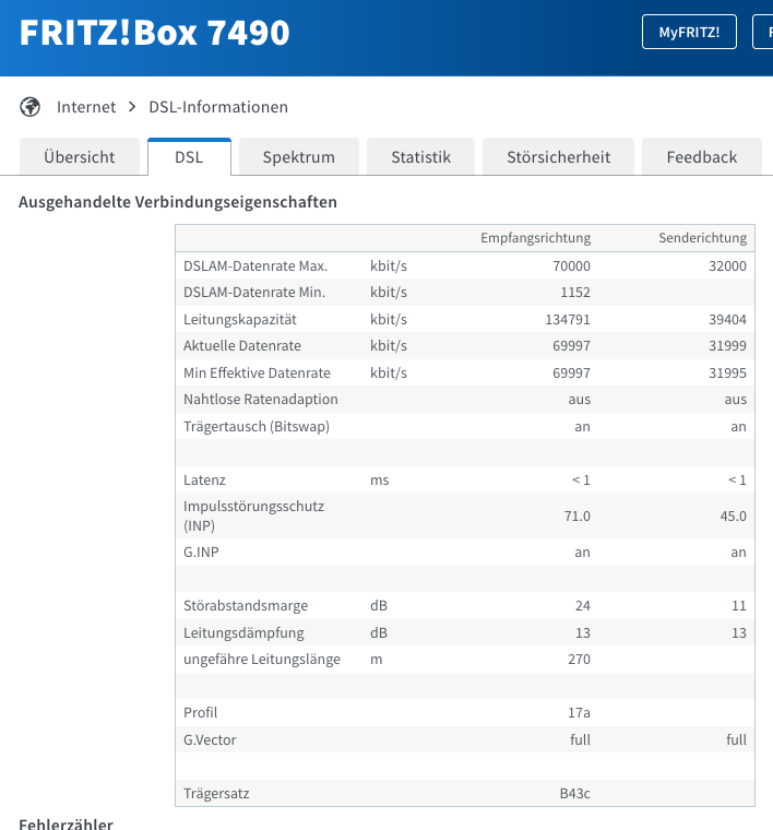 VDSL ist offensichtlich beliebig unübersichtlich, meine FritzBox zeigt aber ziemlich viel davon an. Die WLAN-Geschwindigkeit kommt hier dadurch zustande, dass ich die WLAN-Sendeleistung der FritzBox auf 6% reduziert habe. Wenn einem das versehentlich passiert, hat man auch lahmes WLAN ;)