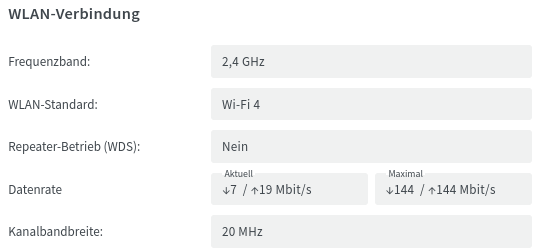 > 2.4GHz -59dBm, max.Datenrate 144/72 Mbit/s, akt.Datenrate 14/7Mbit/s,