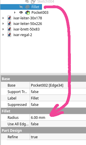 Hier mal ein typisches Anfängerproblem in Freecad. Ich hoffe ihr könnt mir helfen. Problem 1: Wie kann man zum Beispiel den bei einer Rundung eingetragenen Wert bestätigen (=Effekt im Modell sehen)? - Beim Eintippen wird das Modell nicht automatisch aktualisiert (sicher sinnvoll) - Enter drücken übernimmt den eingetippten Wert aber schließt den ganzen Dialog. Korrektur nicht mehr möglich. - Pfeiltasten hoch/runter aktualisiert zwar die Vorschau, es ändert sich aber nicht die Dezimalstelle wo der Cursor ist sondern +/- 1mm. - Mit der Maus außerhalb des Eingabefelds klicken: geht aber umständlich. Problem 2: 2x5mm Rundung an 10mm Kante --> in der Vorschau passiert nichts, wenn man doch mit OK bestätige kommt immerhin --------------------------- Input error --------------------------- BRep_API: command not done --------------------------- OK --------------------------- Muss man da echt 4.99999 eintragen?