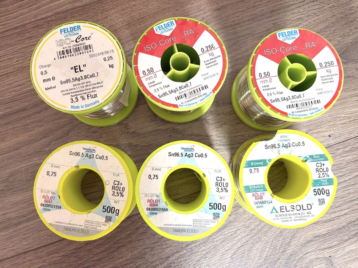 Hallo! Ich habe hier etwas Lötdraht zu verkaufen. Ich dachte an 12 Euro pro 100g. Porto (DHL-Paket, 7 Euro, würden wir uns teilen). Eine komplette Rolle 250g 0,5mm Felder ISO-Core "EL" Sn95,5Ag3,8Cu0,7, 3,5% Flussmittel Zwei komplette Rollen 250g 0,5mm Felder ISO-Core "RA" Sn95,5Ag3,8Cu0,7, 2,5% Flussmittel Eine komplette Rolle 500g 0,75mm ELSold C3+ ROL0 Sn96,5Ag3Cu0,5, 3,5% Flussmittel Eine angebrochene Rolle mit noch 200g 0,75mm ELSold C3+ ROL0 Sn96,5Ag3Cu0,5, 3,5% Flussmittel Eine angebrochene Rolle mit noch 350g 0,75mm ELSold C3+ ROL0 Sn96,5Ag3Cu0,5, 2,5% Flussmittel Bei Interesse bitte Mail an thkusch ät gmail.com Grüße, Thomas