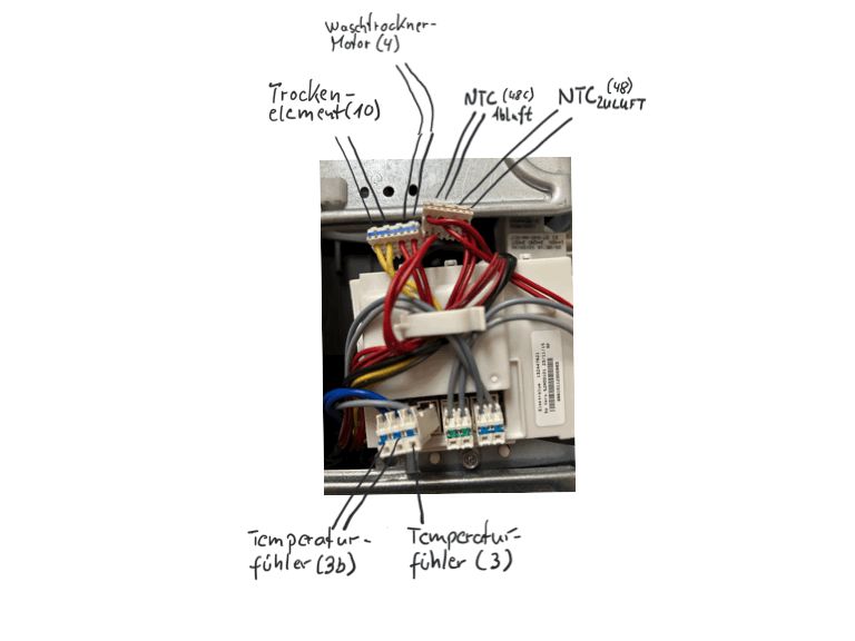 Okay - diesmal habe ich einen Trocknungsgang mit angeschlossenem Frischwasserschlauch durchgeführt. Ergebnis: kein E10-Fehler mehr ... das ist schon mal gut. Aber: die Trockeneinheit wurde leider auch nicht warm und die Wäsche ebenfalls nicht - das ist leider schlecht. Danach habe ich gemessen, ob die Thermosicherung evtl. wieder rausgeflogen war - das war aber nicht der Fall. Das bedeutet nach meiner Interpretation: 1.) entweder bekommt die Trockeneinheit keine Spannung (Relais kaputt?) 2.) oder die Heizspirale(n) in der Trockeneinheit selber sind defekt. Dummerweise kenne ich die Verschaltung dieser Trockeneinheit nicht - sie hat hinten 4 Steckanschlüsse. Mal sehen, ob ich dazu irgendwo noch Informationen finde. Im Anhang findet Ihr ein "Über-Kopf" fotographiertes Bild der Anschlüsse der Trockeneinheit (leider sehr schwer zu fotographieren). Viele Grüße Igel1