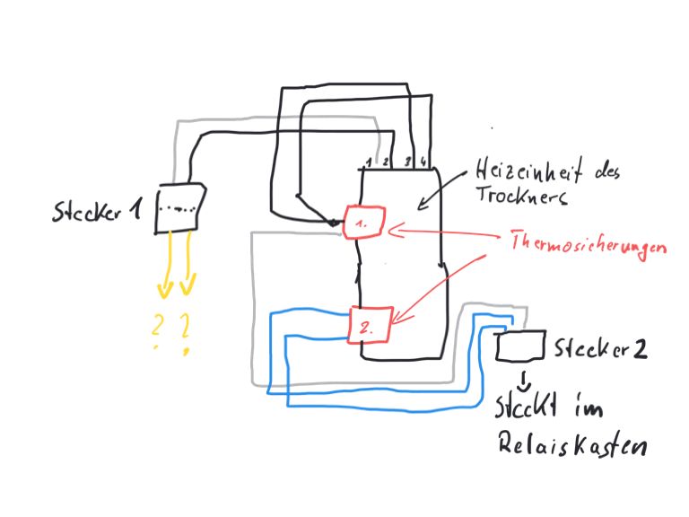 Erst einmal meine Erkenntnisse in Textform. Als Stromlaufplan kann ich das vmtl. erst in 1-2h nachliefern, da ich jetzt gleich mal kurz abwesend bin. - Das Heizelement hat 4 Anschlüsse (die ich im folgenden in der hinteren Draufsicht von links nach rechts durchnummerieren werde) - Folgendes habe ich gemessen (Alle Anschlüsse waren abgeklemmt, aber Anschluss 3 und 4 gehen beide in einen Stecker und ließen sich daher nicht voneinander trennen): 1 - 2: 140 Ohm 1 - 3/4: 70 Ohm 2 - 3/4: 70 Ohm - Anschluss 1 (weißes Kabel) und 2 (schwarzes Kabel) werden auf einen Stecker geführt, der dann auf 2 gelben Kabeln weitergeführt wird und irgendwo in der Maschine verschwindet (muss ich noch weiterverfolgen) - Anschluss 3 (schwarzes Kabel) und 4 (schwarzes Kabel) werden beide auf die schon weiter oben erwähnten 1. Thermosicherung geführt (beide enden in einem Stecker, der auf einem Bein der Thermosicherung steckt) - Das 2 Bein der 1. Thermosicherung sowie die beiden blauen Kabel der zweiten Thermosicherung (?), die ebenfalls in der Heizeinheit steckt (siehe Bild 2 meiner ersten Bilderlieferung) gehen auf einen 3er-Stecker in einen Relaiskasten(?) vorne-oben-rechts in der Maschine Ich weiß, das ist jetzt gerade etwas unschön zu lesen ... Wie gesagt: Stromlaufplan folgt nachher. Meine Interpretation wäre erst einmal: Dort sind 2 Heizspiralen verbaut, die beide je 70 Ohm Durchgang haben, also vermutlich funktionieren. Jetzt müsste ich einfach mal nachmessen, ob die überhaupt im Trocknergang mit Spannung angesteuert werden. Oder habt Ihr noch andere Ideen? Viele Grüße Igel1