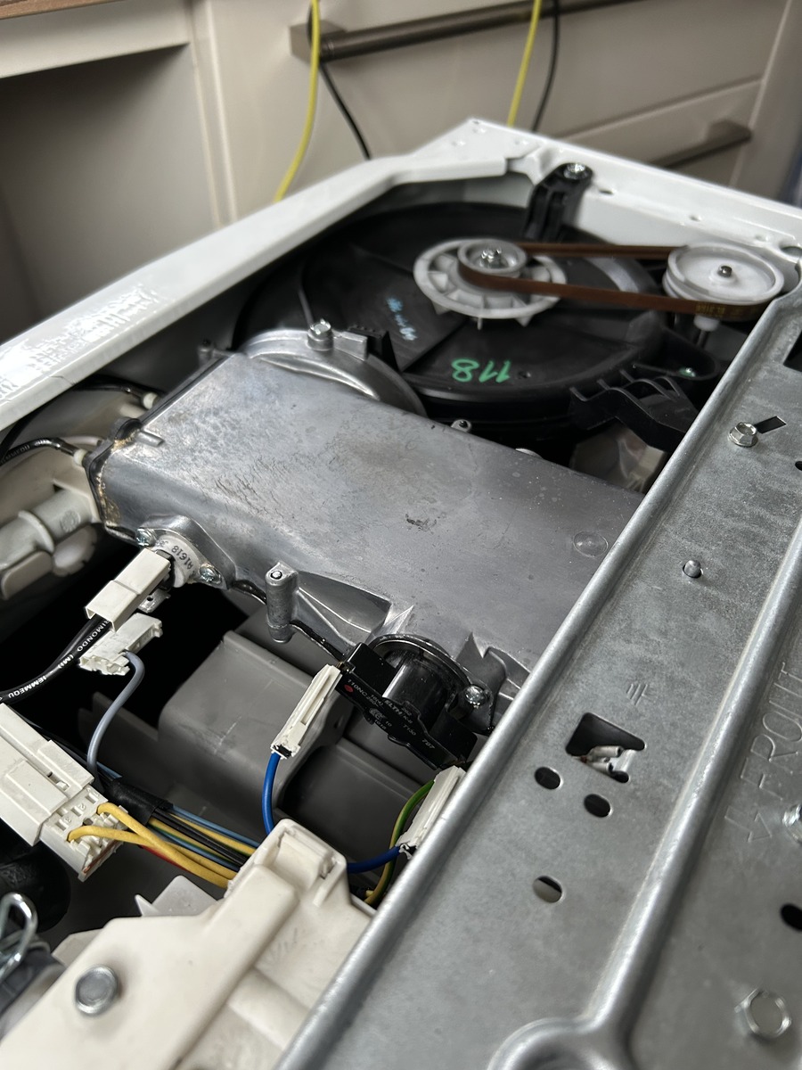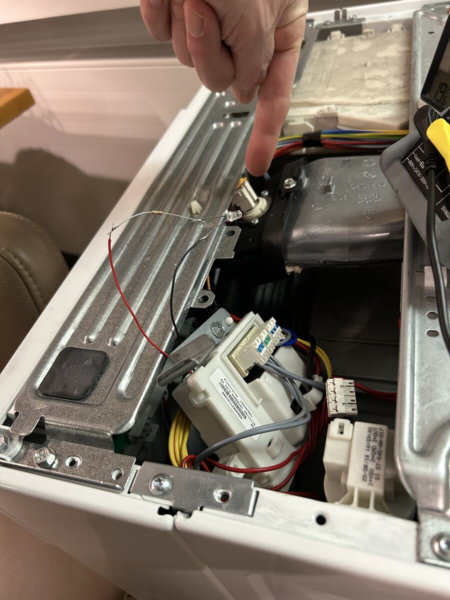Deine Analyse passt. Die Heizung ist aus zeei Teilen aufgebaut. So lässt sich die Heizleistung in zwei Stufen regeln. Kenne ich von den Waschtrocknern, die ich mit gebaut habe. Dit Thermosicherung sitz im gemeinsamen Pfad für beide Teilheizungen (spart ein Teil und damit Geld).