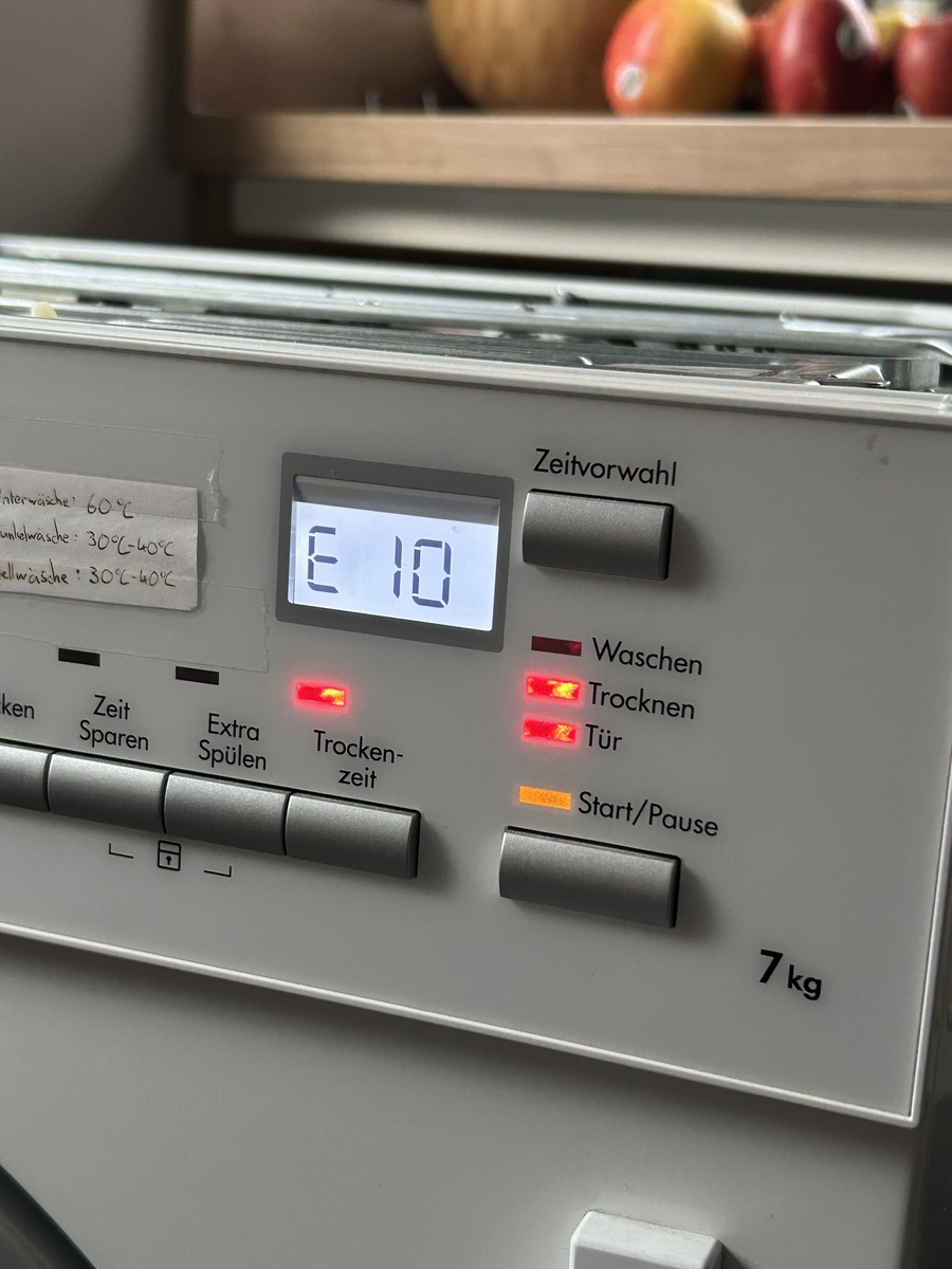 Nachdem ich die ausgelöste Thermosicherung per Druck auf den roten Taster wieder "entsichert" habe, habe ich ein nasses Handtuch in die Trommel geworfen und den Trockner angeschaltet. Zuerst wurde ein bisschen nach links und rechts gedreht und nach 6 Minuten kam dann ein Warn-Piepston, die Maschine blieb stehen und die Fehlermeldung "E10" erschien im Display. Viele Grüße Igel1