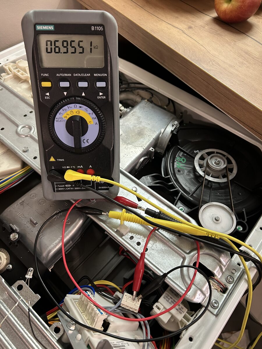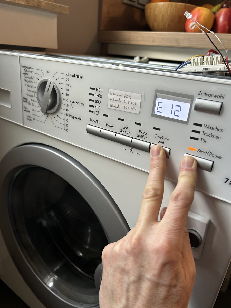 Es gibt interessante Neuigkeiten von der Wäschefront. Dank des Servicemanual-Links von Dieter (https://www.4mcculloch.co.uk/images/mediator/553/599709900.pdf) konnte ich mich etwas mit den Diagnose-Routinen meines Waschtrockners beschäftigen. Zum einen habe ich den Fehlerspeicher zurückgesetzt (vgl. Manual Kapitel 5.4) - das hat gut funktioniert. Sodann habe ich das Diagnoseprogramm 9 (vgl. Kapitel 4.3 auf S.9 des Manuals) gestartet. Das Ergebnis seht Ihr im angehängten Video: Der Trockner lief sauber an und hat die Heizung dann genauso sauber eingeschaltet und fröhlich hochgeheizt (die Zuluft und Ablufttemperatur wird abwechselnd im Display angezeigt). Bei 92 Grad Zuluft- und 48 Grad Ablufttemperatur habe ich das Experiment dann abgebrochen, weil mir nicht klar war, ob die Diagnoseroutine auch irgendwann Schluss macht, oder das Dingen bis zur Selbstauflösung (bzw. Thermo-Sicherungsauslösung) hochheizt. Eine Fehlermeldung wurde bei dem ganzen Experiment nicht geworfen. Aber die Erkenntnis aus der Diagnoseroutine 9: Die Maschine ist grundsätzlich in der Lage, Lüfter und Heizwendel des Trockners einzuschalten. Und auch ein ganzes Weilchen hochzuheizen. Außerdem scheinen die NTC's auch Temperatur zu messen. Das ist ja schon mal gut! Schön sieht man übrigens auch, wie die freiverdrahtete Diagnose-LED anzeigt, dass die Spule des Heizungs-Relais bestromt wird (Idee von Wolf17). Soweit so gut also erst einmal. Viele Grüße Igel1