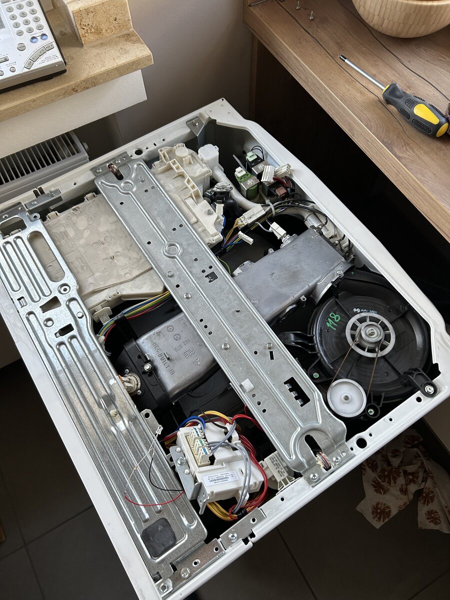 Teo D. schrieb: > Nenenee Der da wars: Danke für die Blumen, aber dass es 13 Minuten Kaltnachlauf geben könnte, war mir nicht aufgefallen. Andreas S. schrieb: > Und ausbauen und reinigen muss ich die Trocknereinheit so oder so auch > noch, denn eine einmal ausgelöste Thermosicherung wird schon Ihre Gründe > bzw. Ihre Fusseln haben ... Ich würde vor einem Ausbau erst nachsehen: Wolf17 schrieb: > Schalter 3B ausbauen und ins Gehäuse > schauen, ob das innen noch sauber ist. Dann ist kein Ausbau zur > Reinigung nötig. Eine Endoskopkamera wäre nützlich. Die heiße Luft strömt doch in den Bottich. Kann man die Maschine ankippen und den Wärmetauscher vielleicht durch das Sensorloch ausspritzen?