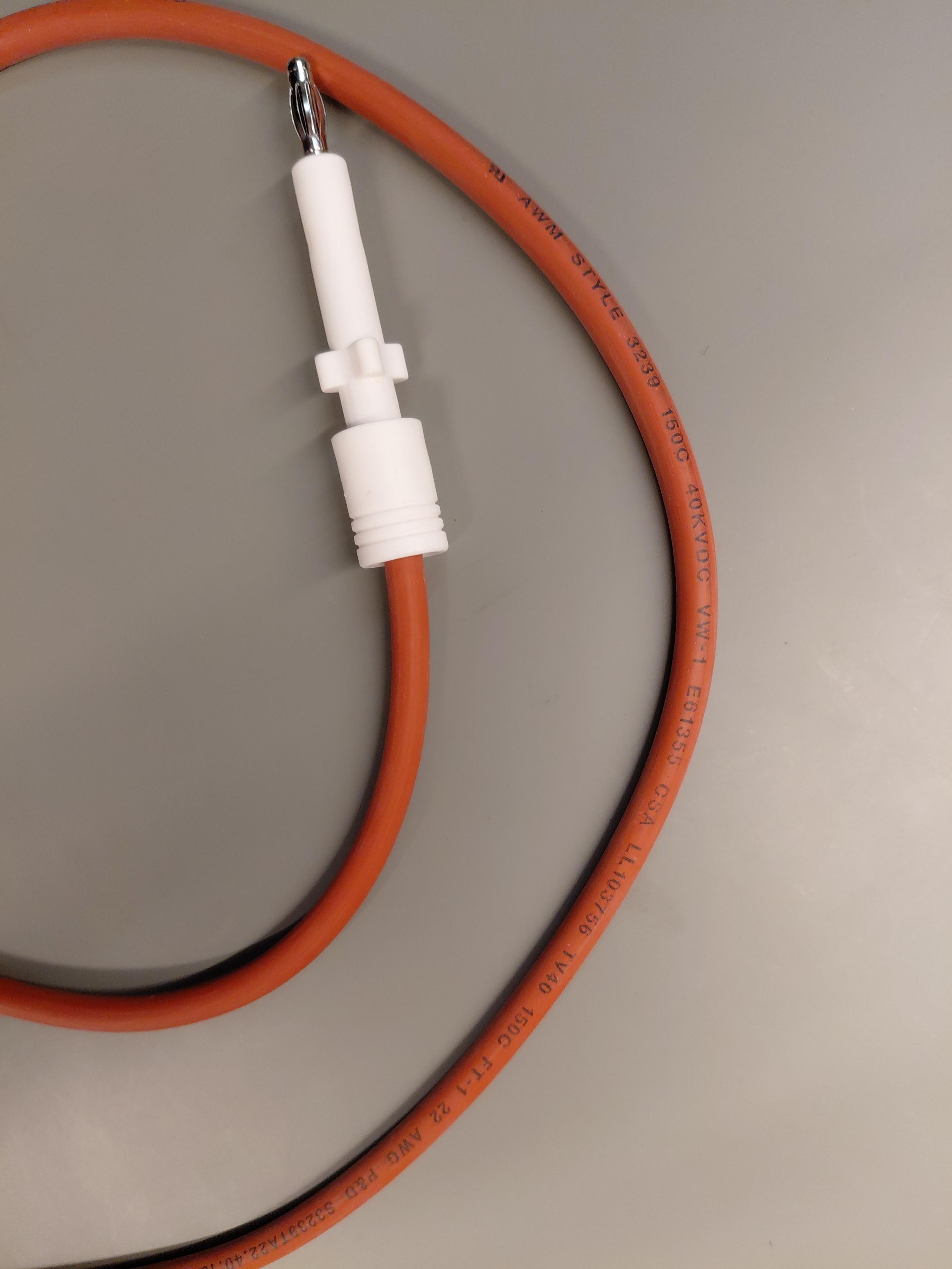 McGyver: Men nehme ein Stück RG58, Schirm entfernen und 4mm Bananenstecker vorn anlöten und mit Heißkleber stabilisieren. Fertig ist der HV Stecker. Sind ja nur 5kV AC. Die Stecker gibt es als Löt- bzw. Schraubversion für eine handvoll Euro.