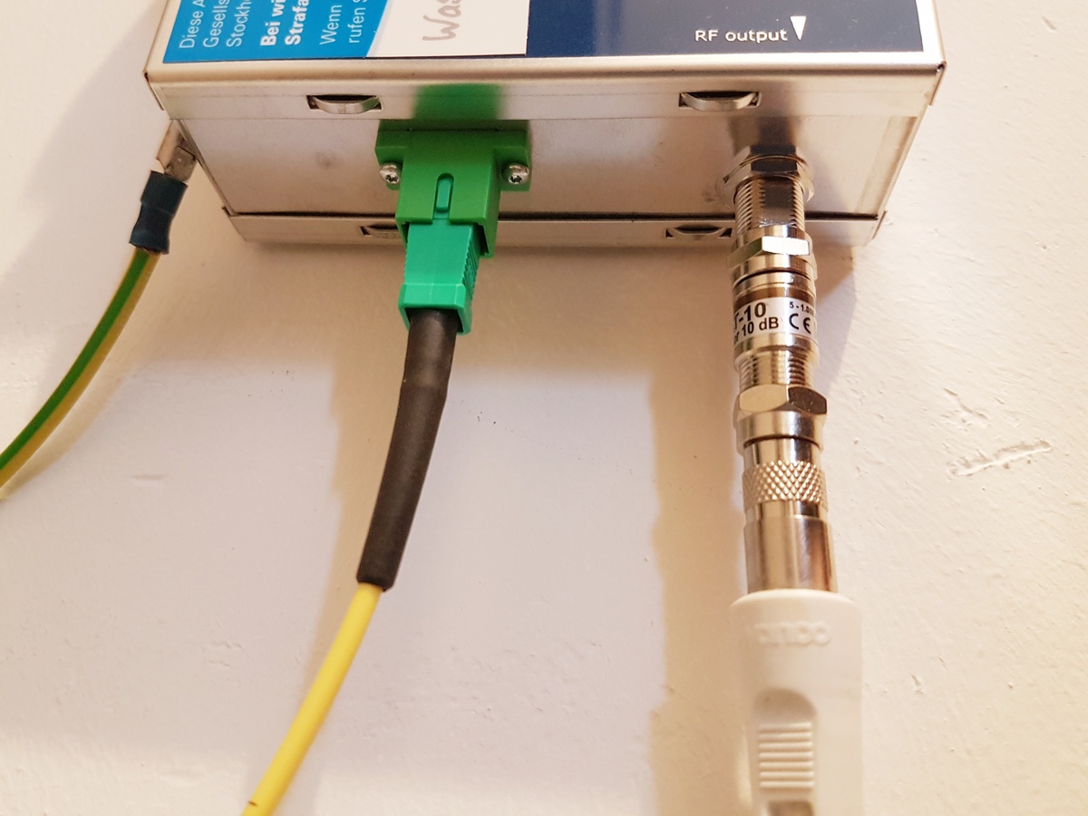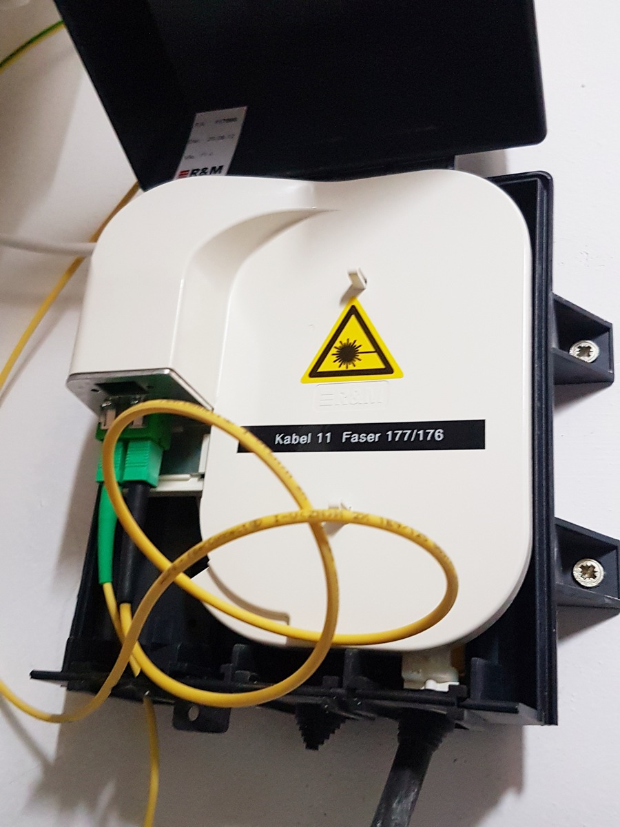 Hans Markus G. schrieb: > Das schwarze ist das Kabel aus der Straße? Ja, das dicke schwarze Glasfaserkabel kommt direkt aus dem Erdboden raus und geht in die Spleißbox rein, wo die dicke Glasfaser auf 4 einzelne Anschlüsse verteilt gleichmäßig aufgesplissen wird. Davon werden momentan aber nur zwei Anschlüsse benötigt. Hans Markus G. schrieb: > Hast du zwei Glasfaser Anschlüsse? Ja, ein gelbes Glasfaserkabel geht von der Spleißbox zum Glasfasermodem und von da aus geht's dann mit einem gelben Netzwerkkabel (RJ45) weiter zur Fritzbox (Router). Das zweite gelbe Glasfaserkabel aus der Spleißbox geht dann zu einem speziellen Home Optical Receiver, der aus dem Glasfasersignal, in dem ja auch das Internet rumschwirrt, das Radio- und Fernsehsignal rausfiltert und auf eine 75 Ohm F-Buchse ausgibt, an der ein 10dB Dämpfungsglied nachgeschaltet ist, bevor das Radio- und Fernsehsignal dann weiter über ein 75 Ohm Koaxkabel an die Wohnräume verteilt wird.